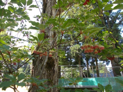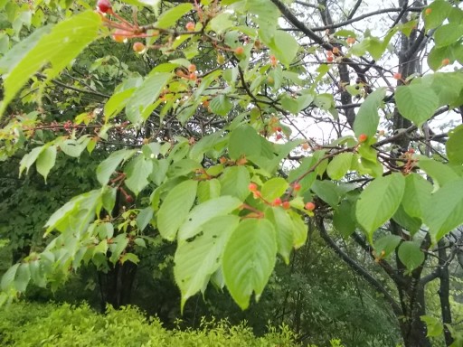 | これはサクラの木だろう。 サクランボが生っている。 セイヨウミザクラかもしれない。 【参考】 セイヨウミザクラの実