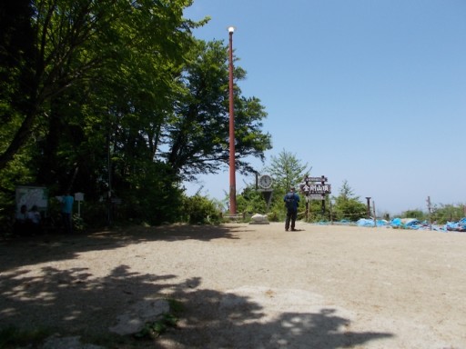 | 右に鳥居。 中央にスピーカーが見えてきた。 明神山頂に到着。