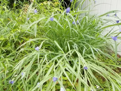 | この青い小さな花が咲く植物は、ムラサキツユクサとみられる。 【AI による概要】 ムラサキツユクサは、北米原産のツユクサ科の多年草で、日本には明治時代に渡来して以来、全国に広がり、野生化もしています。 朝に開いて夕方にはしぼむ一日花で、紫色の花を咲かせます。 また、雄しべにある長い毛を顕微鏡で観察する実験などにも使われます。
