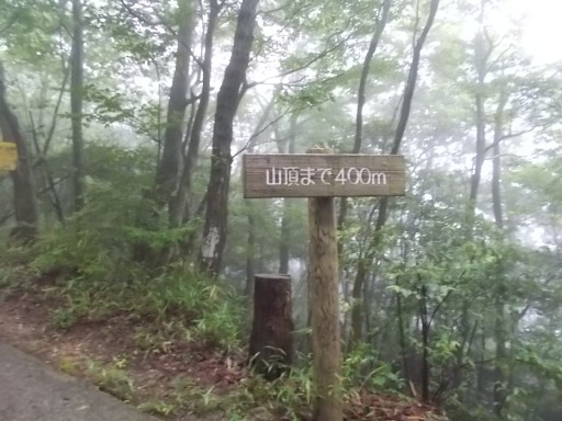 | 「山頂まで400m」のポイントに到着。 いよいよガスってきた。 しかし、一本道なので、道迷いはないだろう。