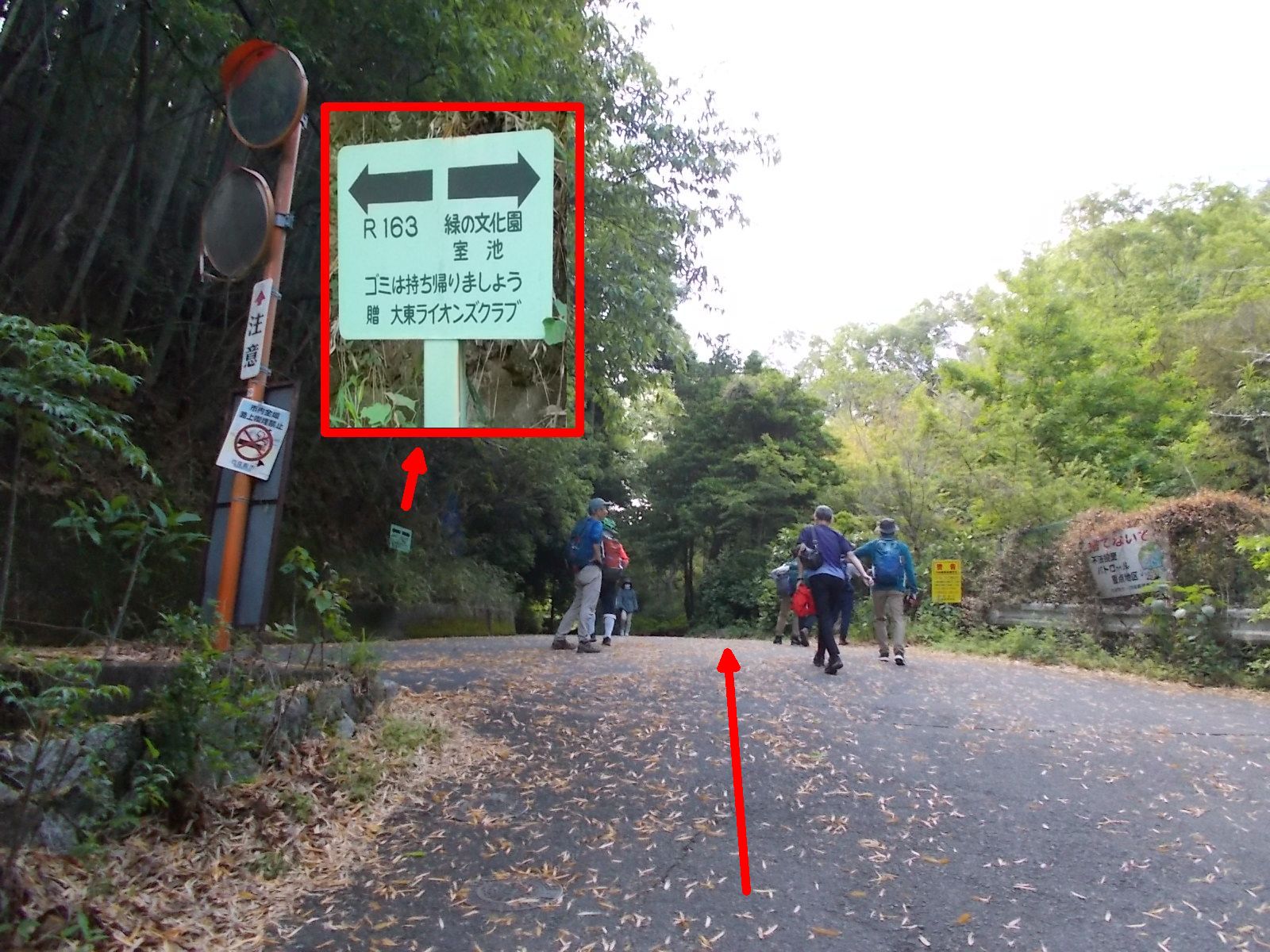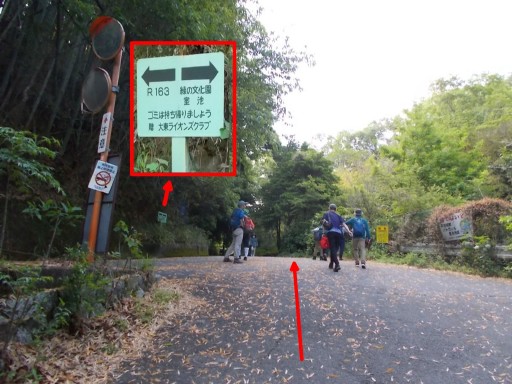 | この先で左後方、R163方面からの道路が合流。 コースは引き続き直進。 合流地点に立つ大東ライオンズクラブが立てた道標を画像に貼り付けた。(赤四角印)
