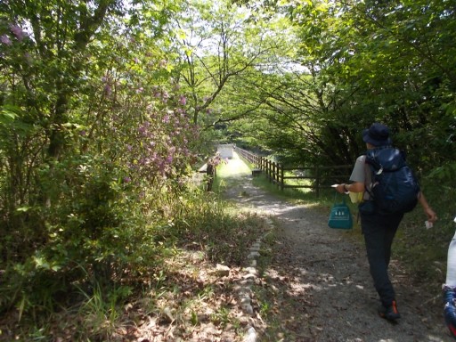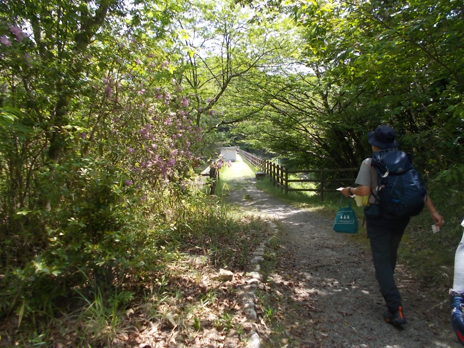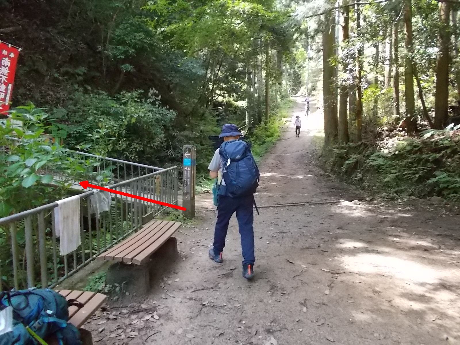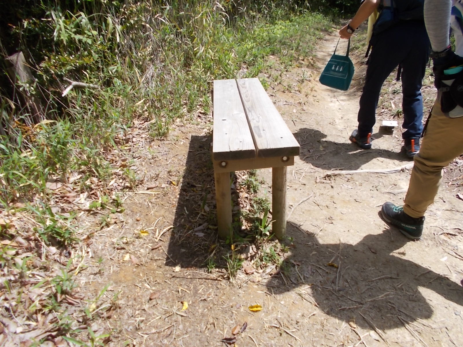 | ベンチが置かれた分岐に到着。 コースは左折して橋を渡る。