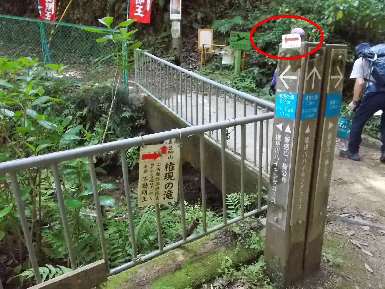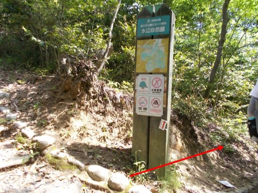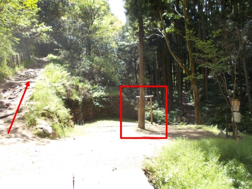 | コースは左上に続くハイキングコースを歩く。(赤矢印) 右方向は権現の滝へと続いている。 この日のコースでは立ち寄らず。 小さな鳥居が見える。(赤四角印)