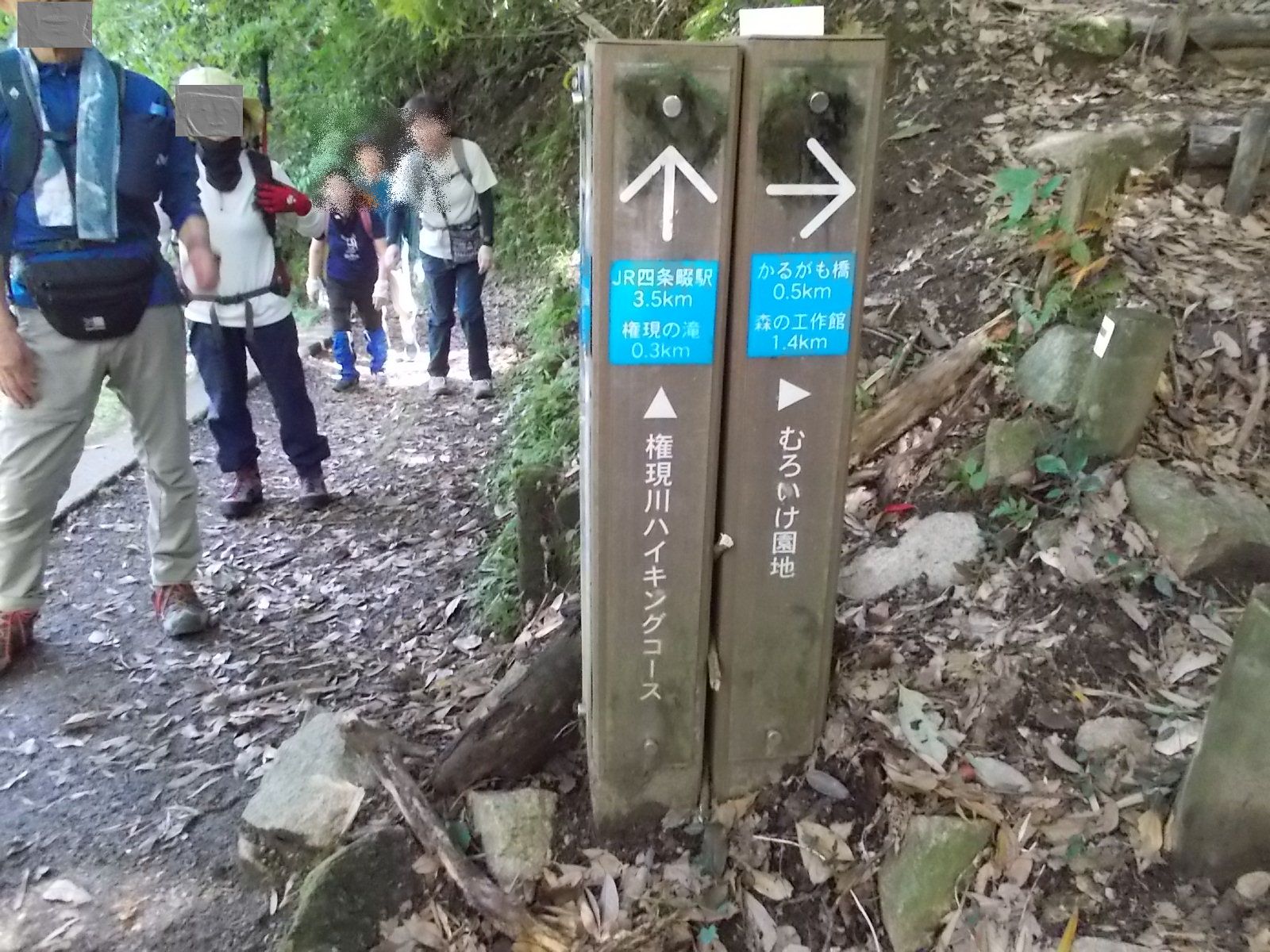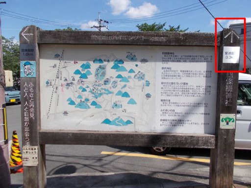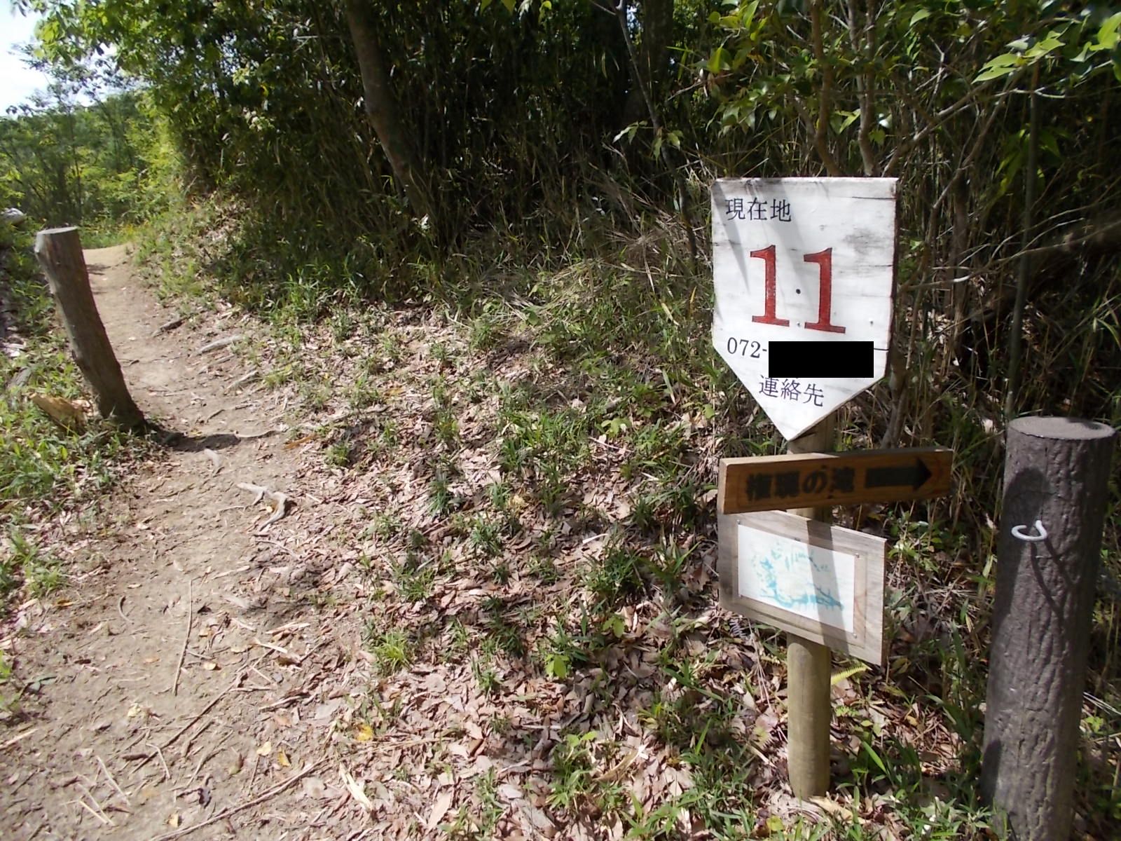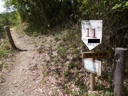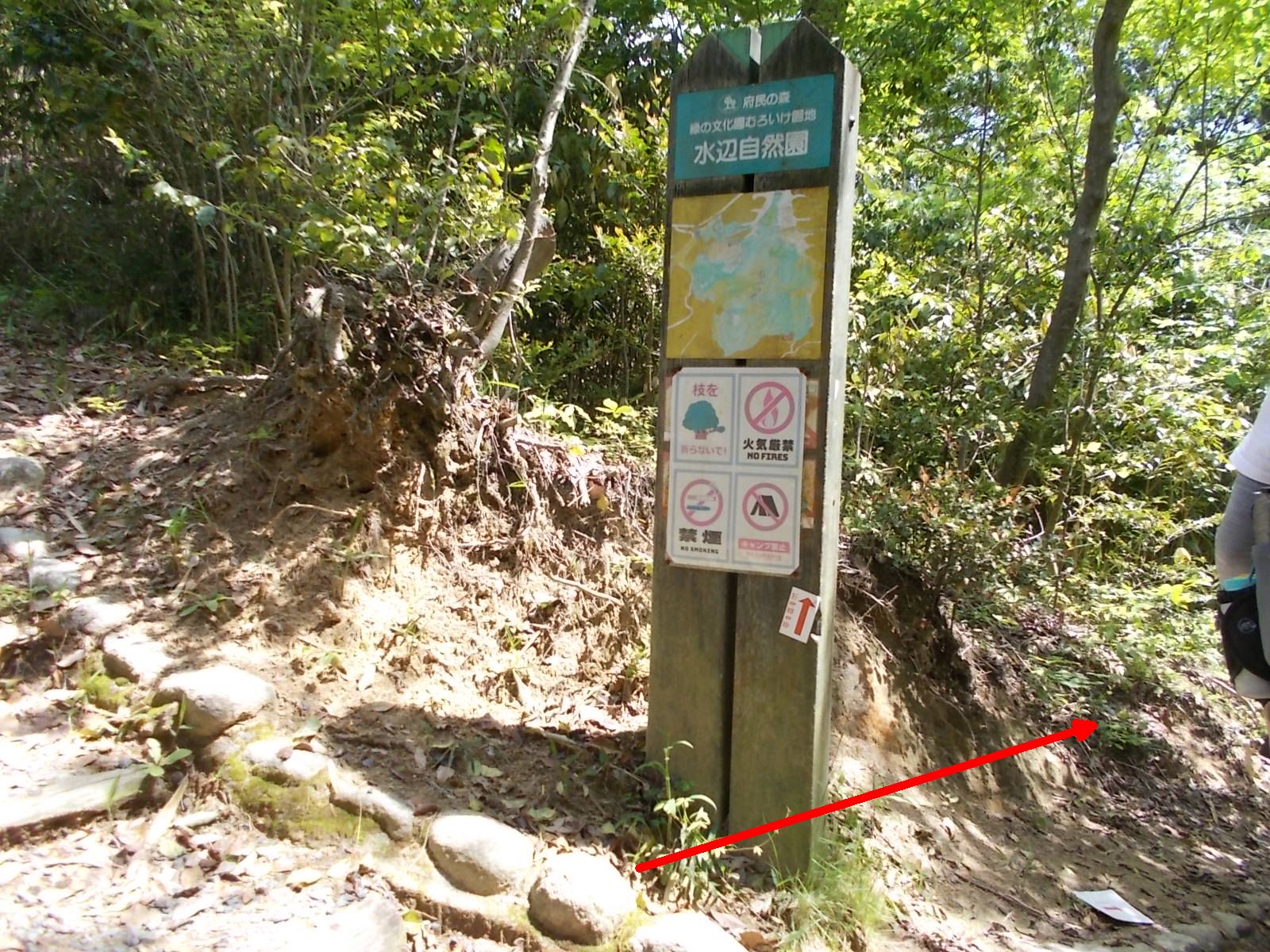 | 急登への取り付きに立つ道標。 「かるがも橋0.5km / 森の工作館1.4km」と記されている。 また、ここまで四条畷駅からの距離は3.5km。