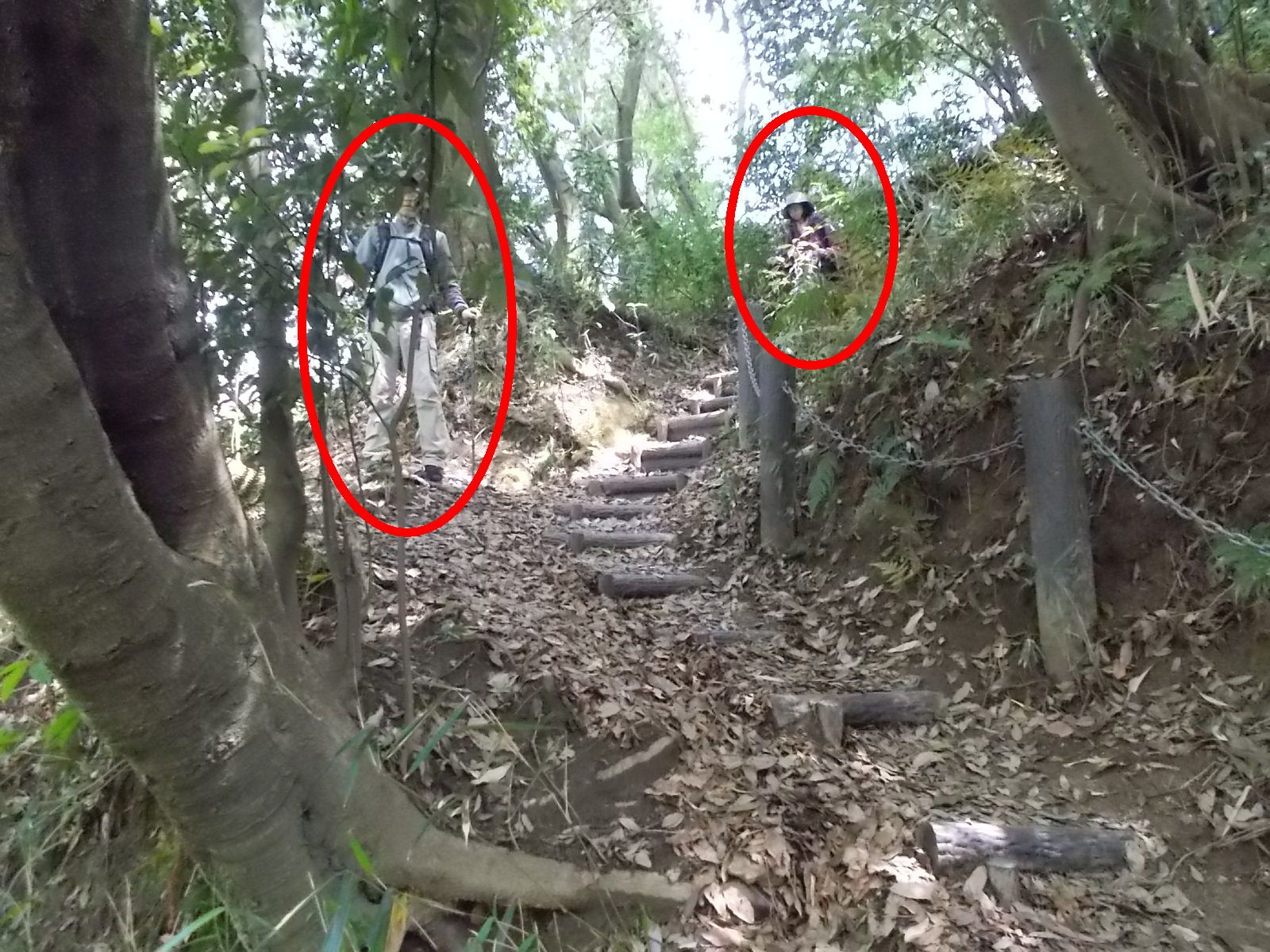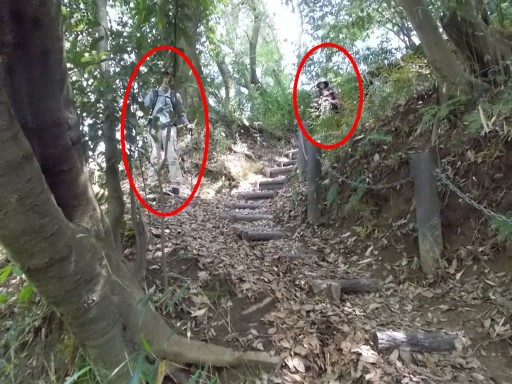 | もう少しで階段は終わる。 前方に二人の登山者の姿。 当方は多人数なので、先に降りてくださいと、リーダー他が声掛けした。