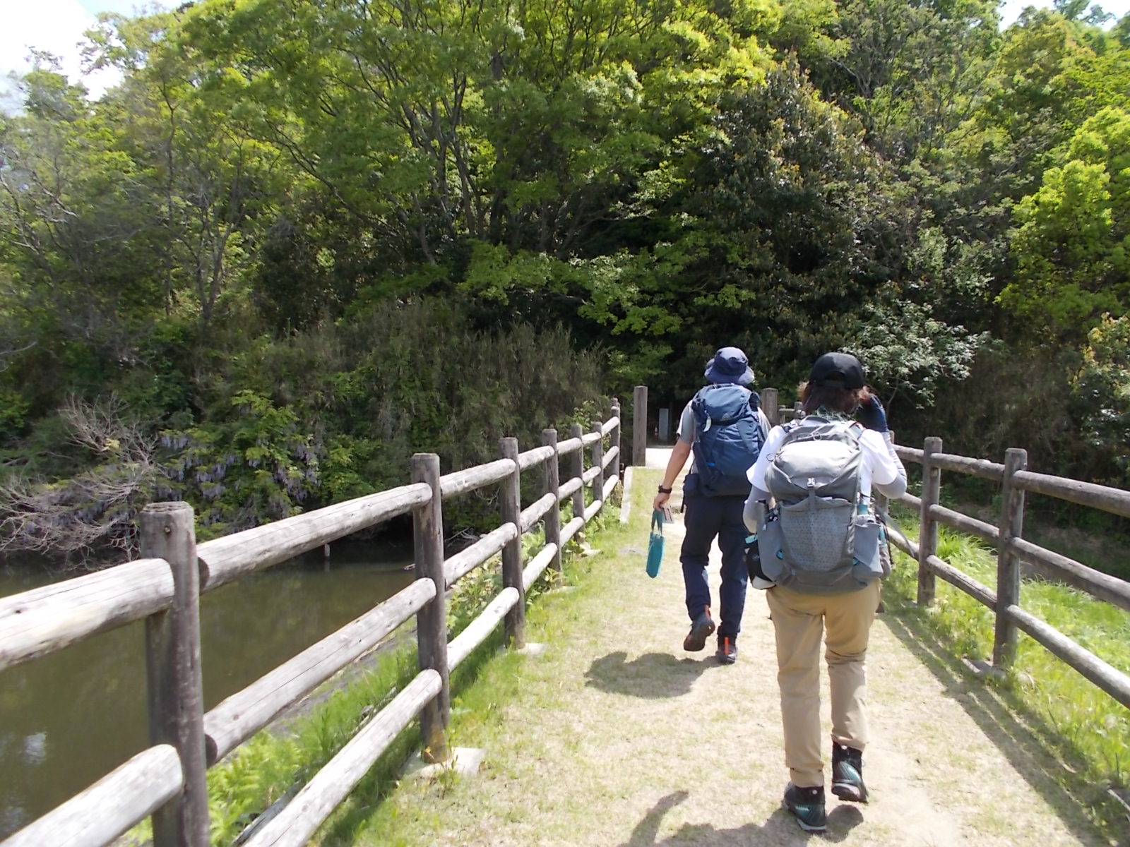 | かるがも橋と云っても、ここまで歩いて来たのは橋ではない。 堤防のようなイメージ。歩いて来た道は地面の上に続いている。 ここから先、少しだけ木製の橋が架かっている。 これが「かるがも橋」。 撮影した画像では橋の部分が分かりにくい。