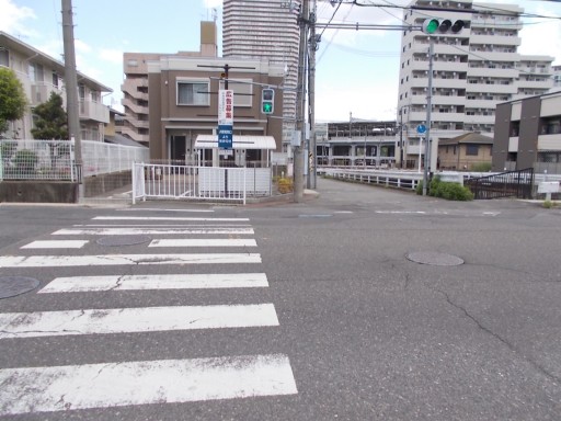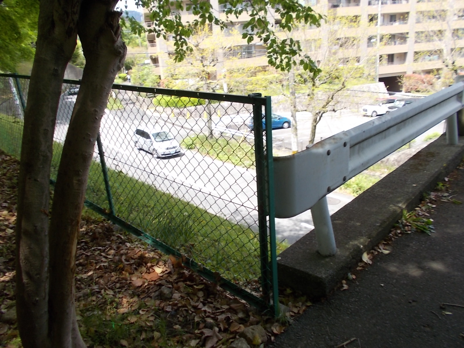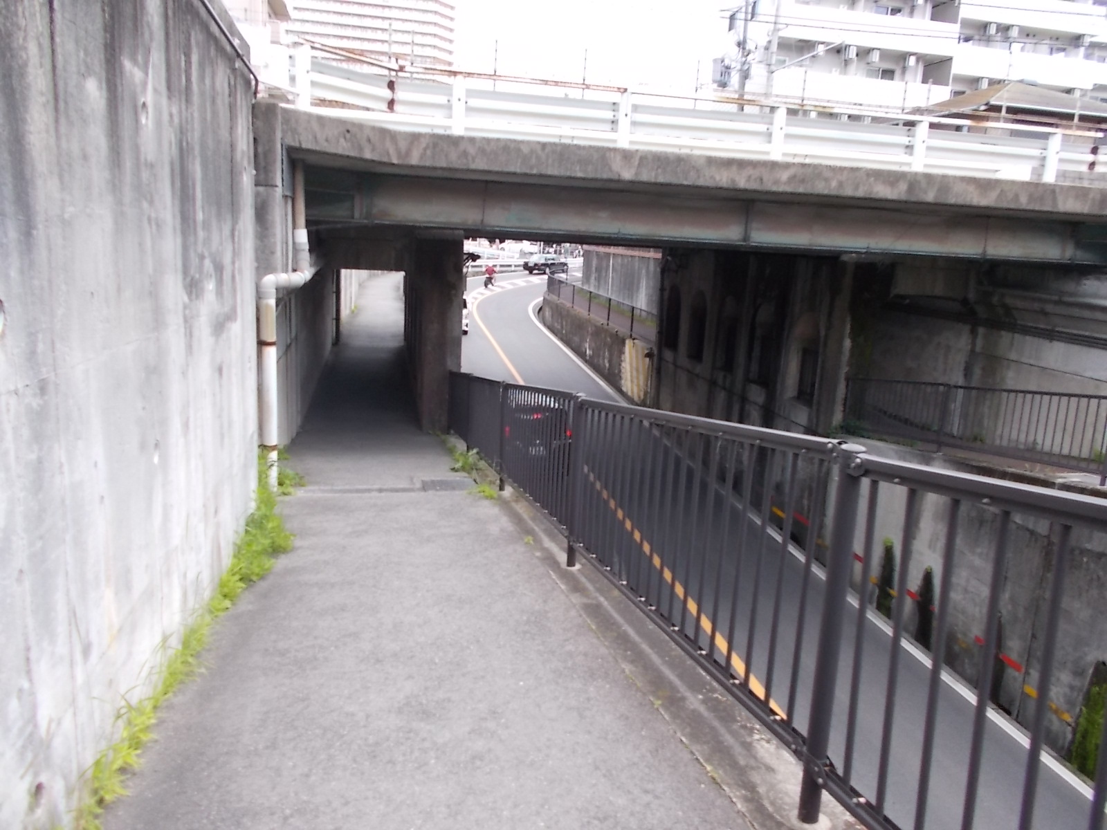 | 跨道橋の階段を降りて左へ。 Uターンして右に見える道路に出る。 (=跨道橋の下の道路に出る)