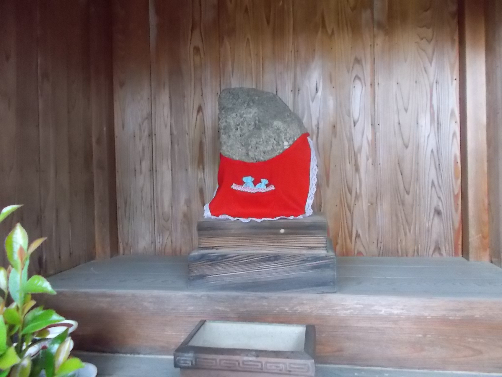 | 説明書きの通り、お地蔵様のお姿が彫られているわけではなく、自然石をそのまま祀られている。 もっとも、涎掛けを外さなかったので、確実なことは言えないが。