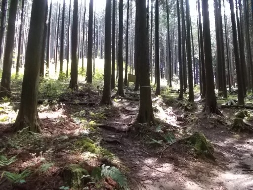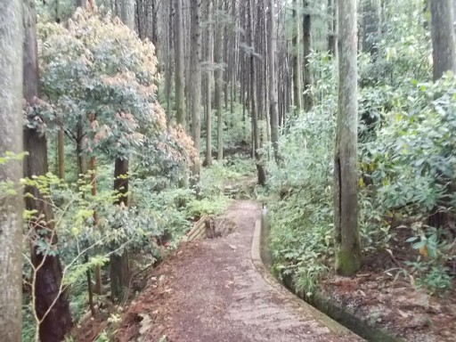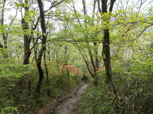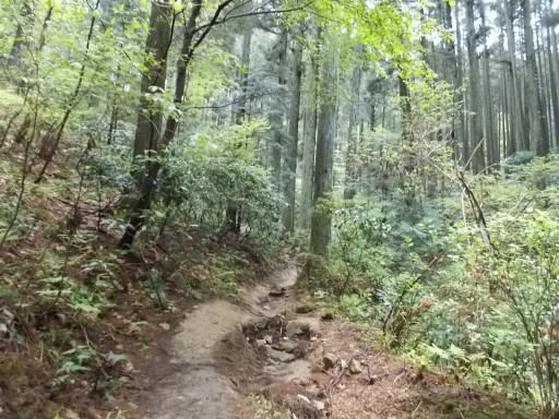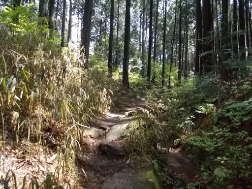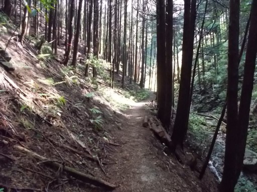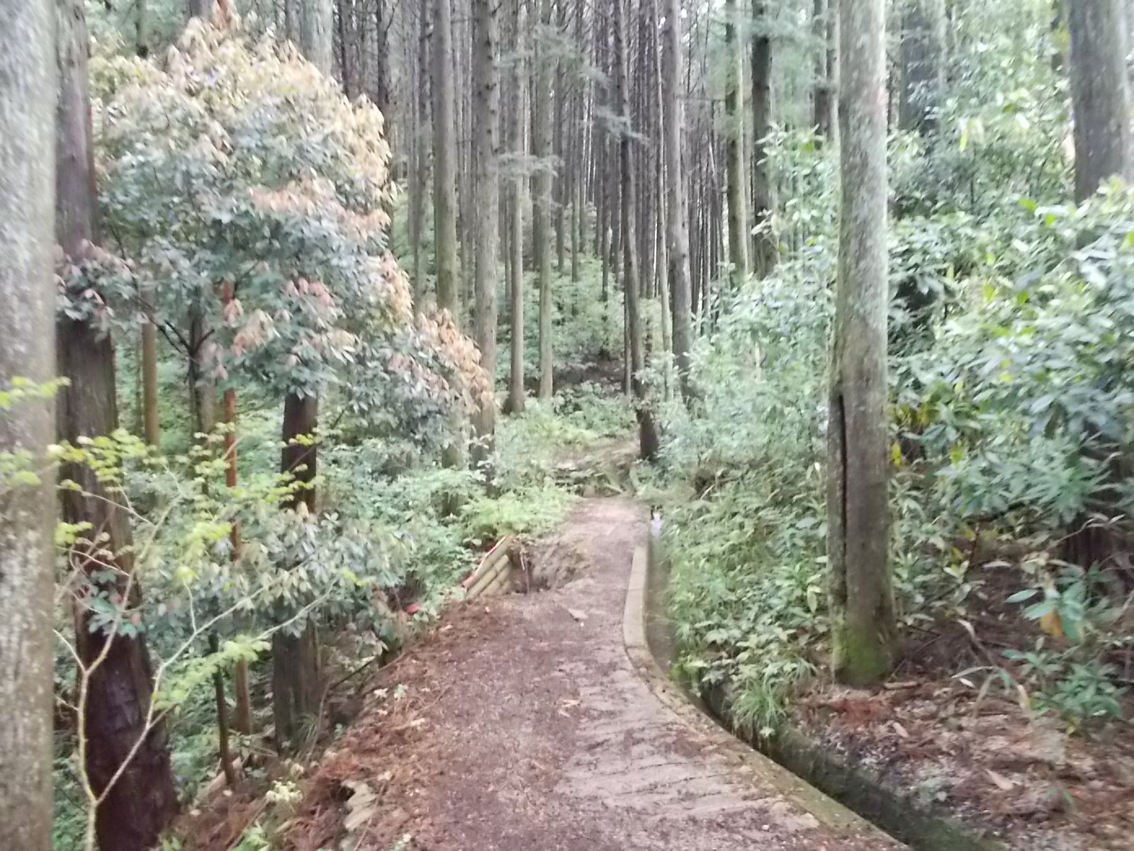 | 植林帯の中に続くやや薄暗い登山道を歩く。