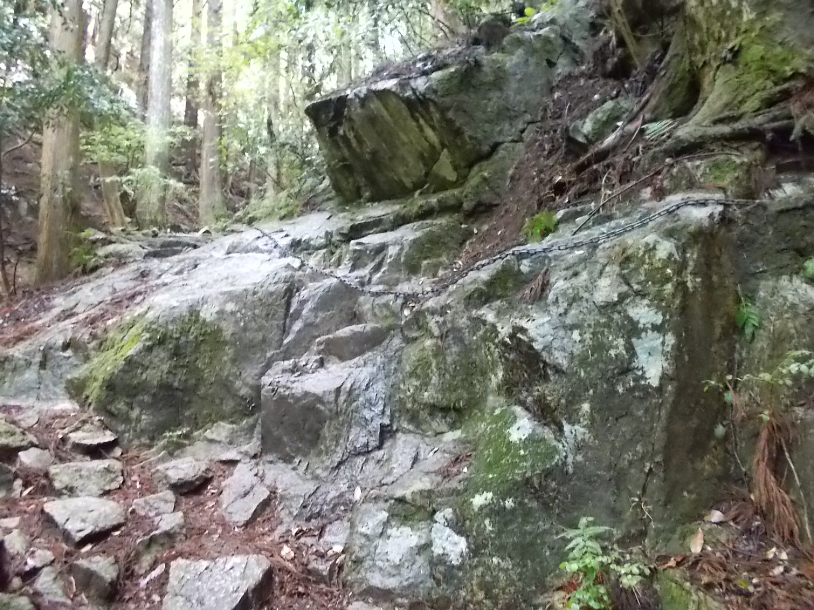 | 天狗谷の名前の由来となっている天狗岩。 鉄の鎖が見えるが、必要に応じて使う。