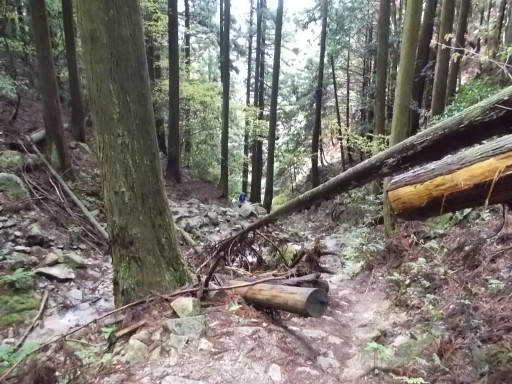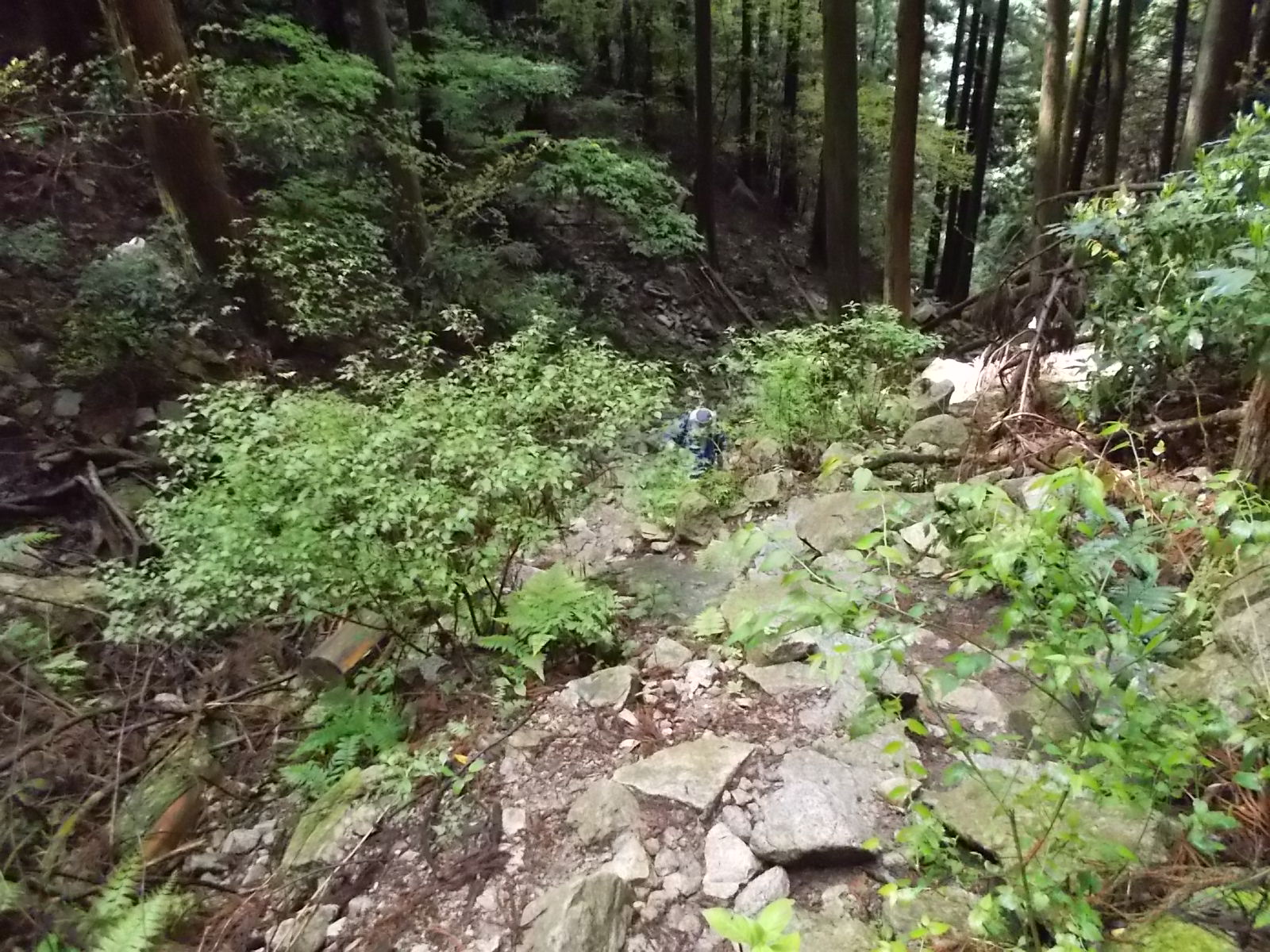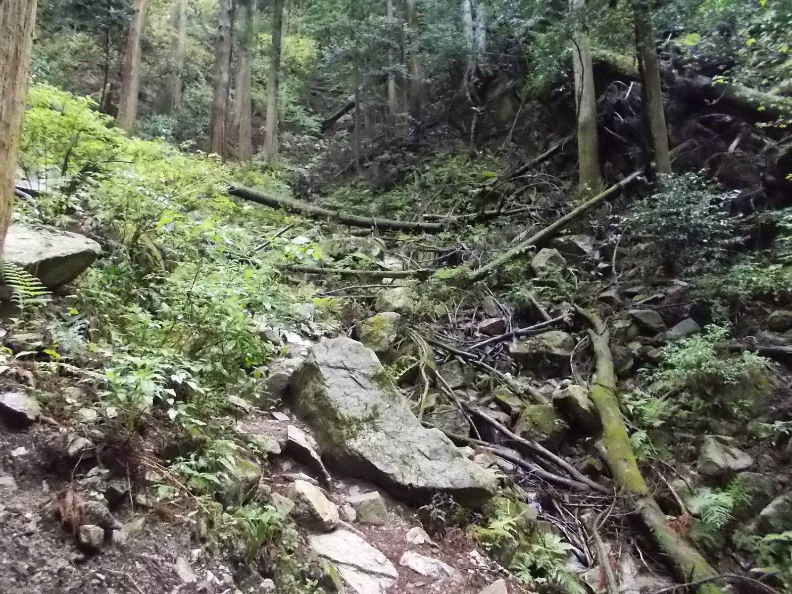 | 植林帯の中に入る。 この先、登山道の左側が崩落している。