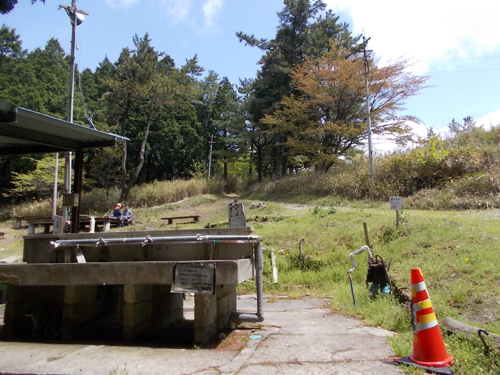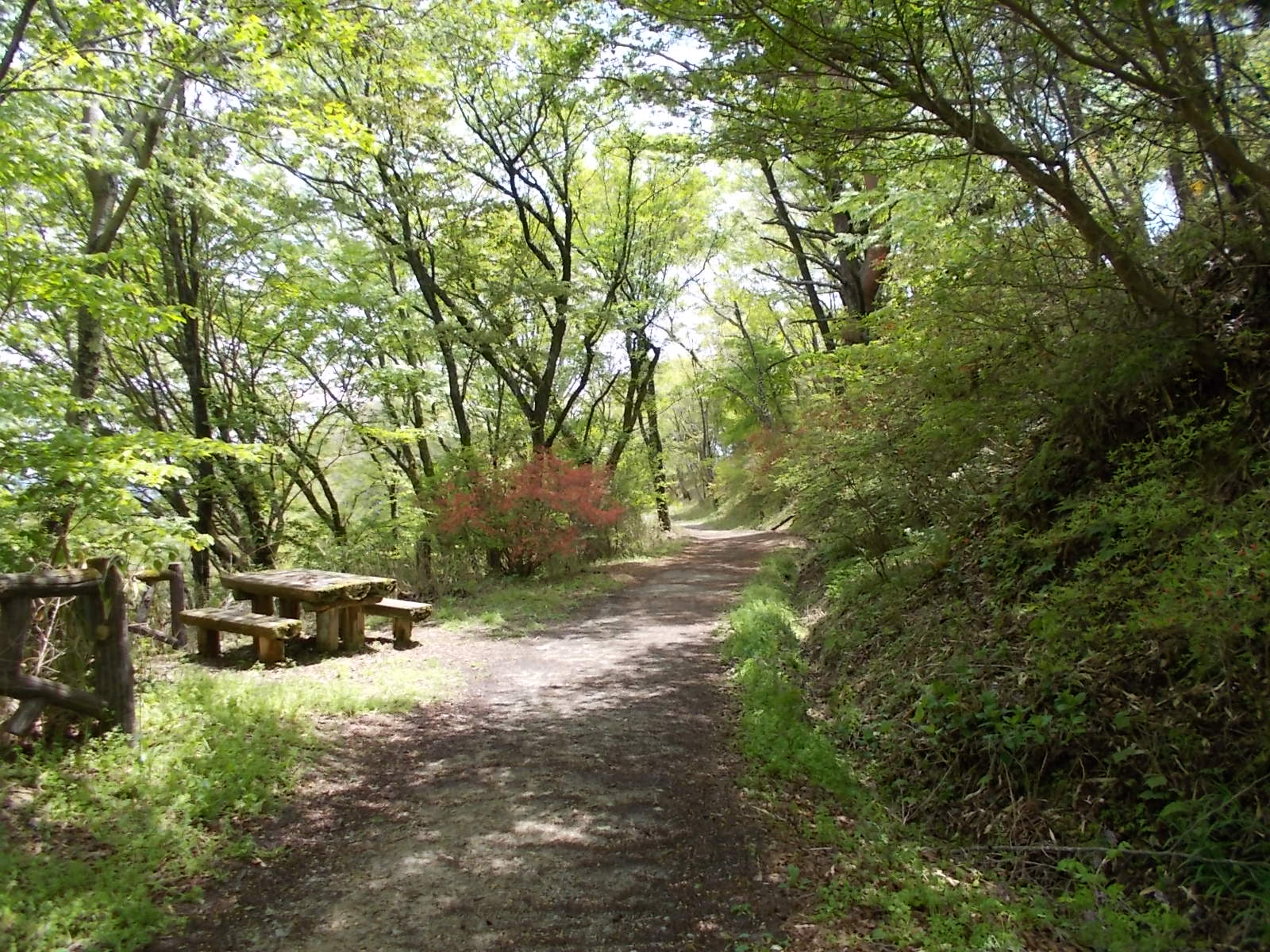 | 簡易ベンチが置かれた中間地点に到着。 ここが青崩のバス停から山頂までの中間地点くらいになる。 ここで小休止。
