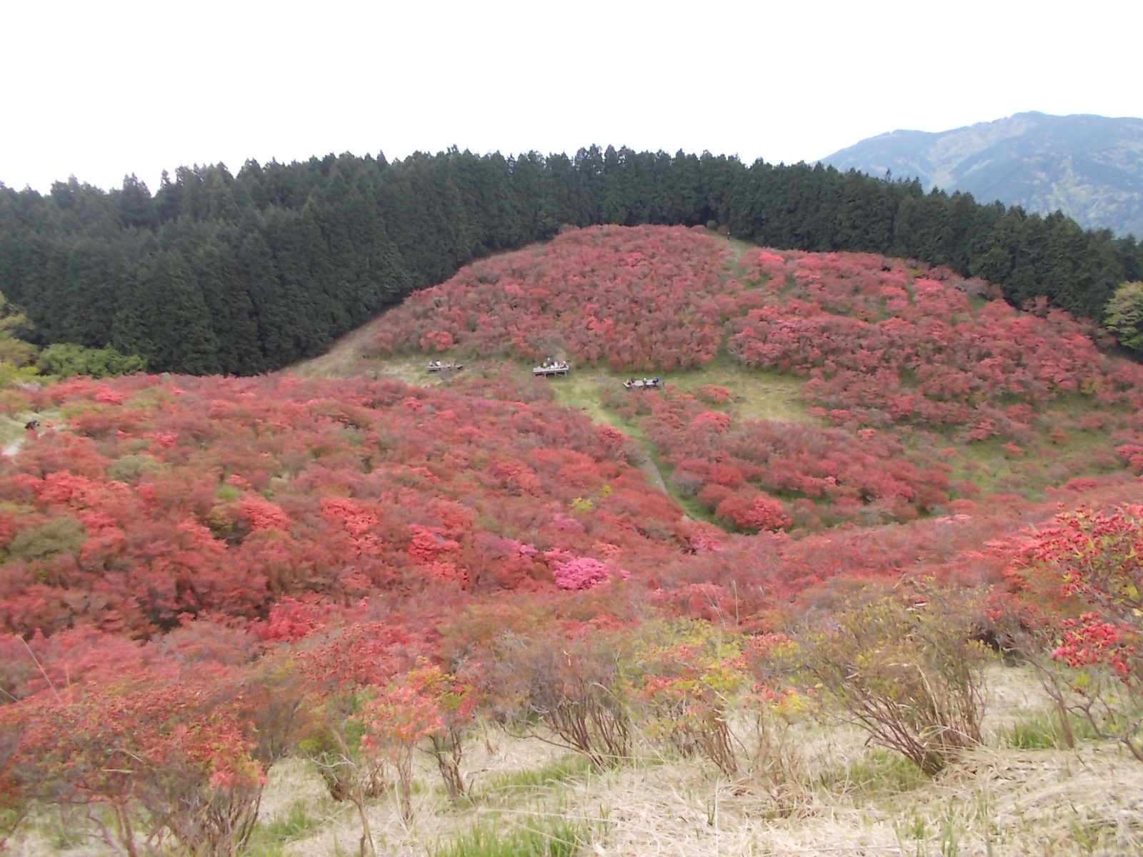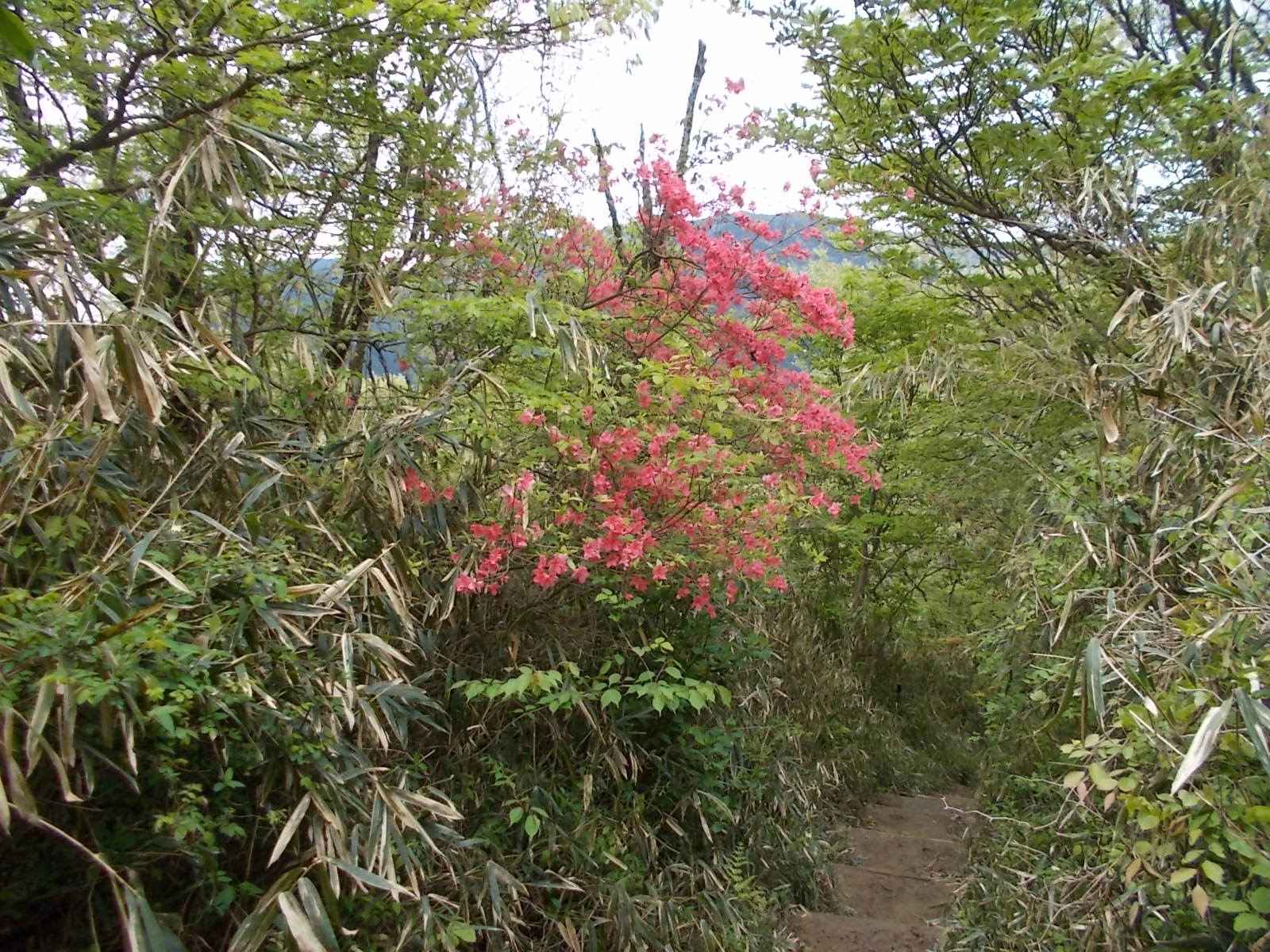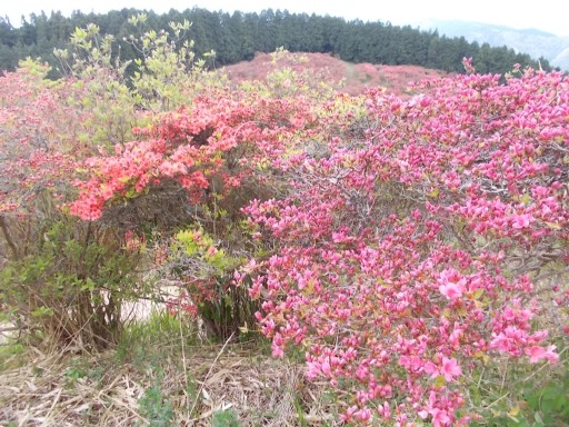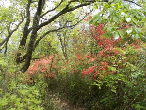 | ここでは、ヤマツツジは他の雑木と競い合って咲いている。 山頂の自然ツツジ園では、ツツジ以外の樹木や下草を、毎年刈り取っている。 なので、植栽したように思う人がいるだろう。 人間が手を加えているので、半分、植栽したようなものだとも思う。