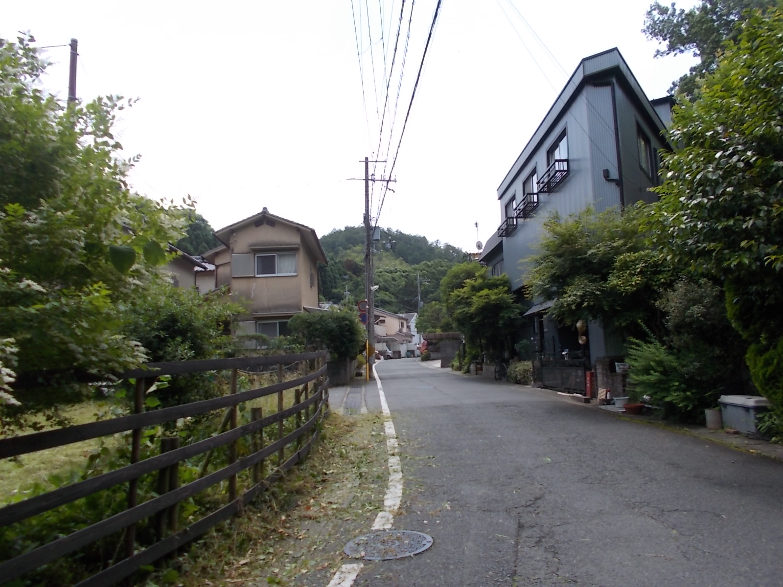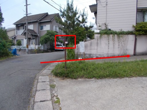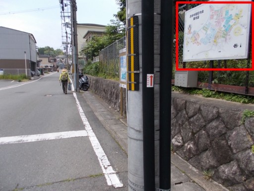 眼下に見える茶色っぽい長方形は、立命館大学原谷グランドと見られる。 その向こう側に見える緑っぽい長方形は同大学の原谷サッカーグランドだろう。 これらの施設は、先程まで歩いていた千束御室線沿いに位置している。 我々は原谷中央公園を右折したが、左折するとこれらの施設の西側を通ることになるようだ。 つづく。