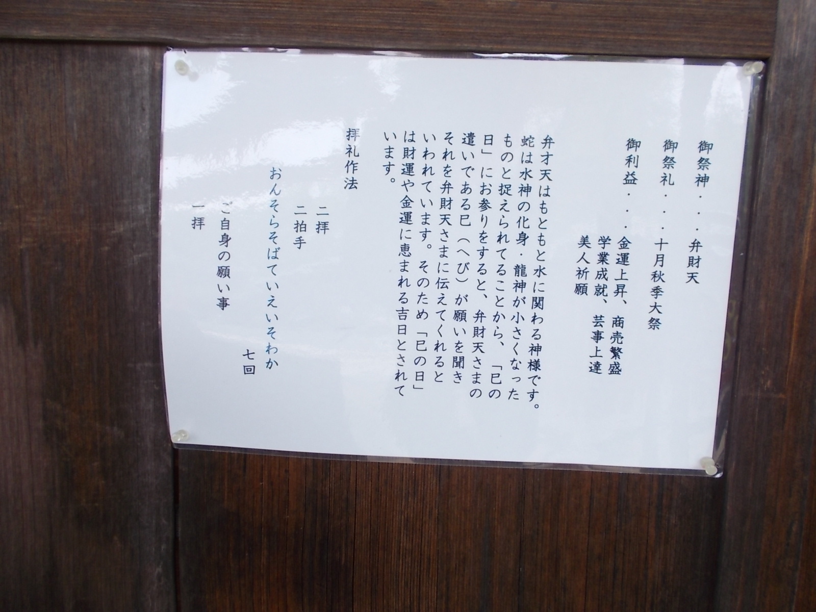 御祭神···弁財天 御祭礼···十月秋季大祭 御利益···金運上昇、商売繁盛、学業成就、芸事上達、美人祈願 弁才天はもともと水に関わる神様です。 蛇は水神の化身・龍神が小さくなったものと捉えられてることから、「巳の日」にお参りをすると、弁財天さまの遣いである巳(へび)が願いを聞き それを弁財天さまに伝えてくれるといわれています。 そのため「巳の日」 は財運や金運に恵まれる吉日とされています。 拝礼作法 二拝 二拍手 おんそらそばていえいそわか 七回 ご自身の願い事 一拝