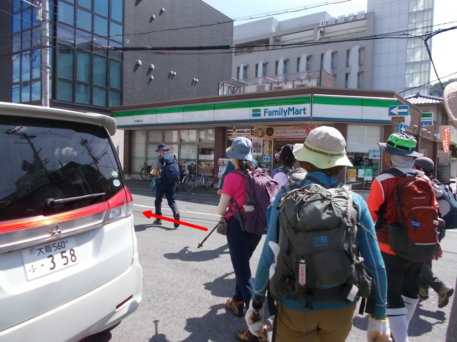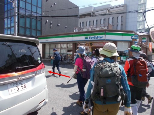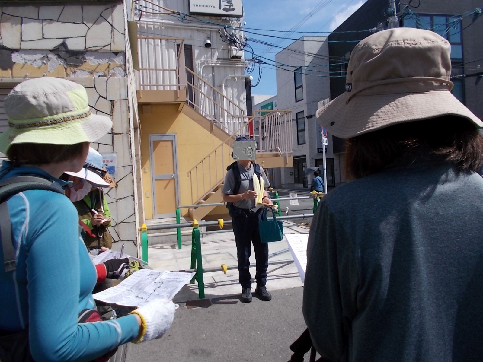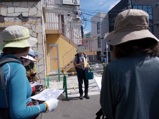 | 四条畷駅東出口前で、この日歩くコースの説明をするNoリーダー。