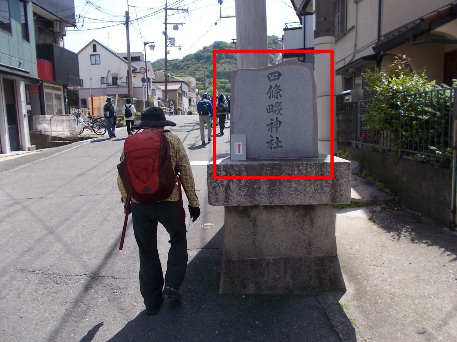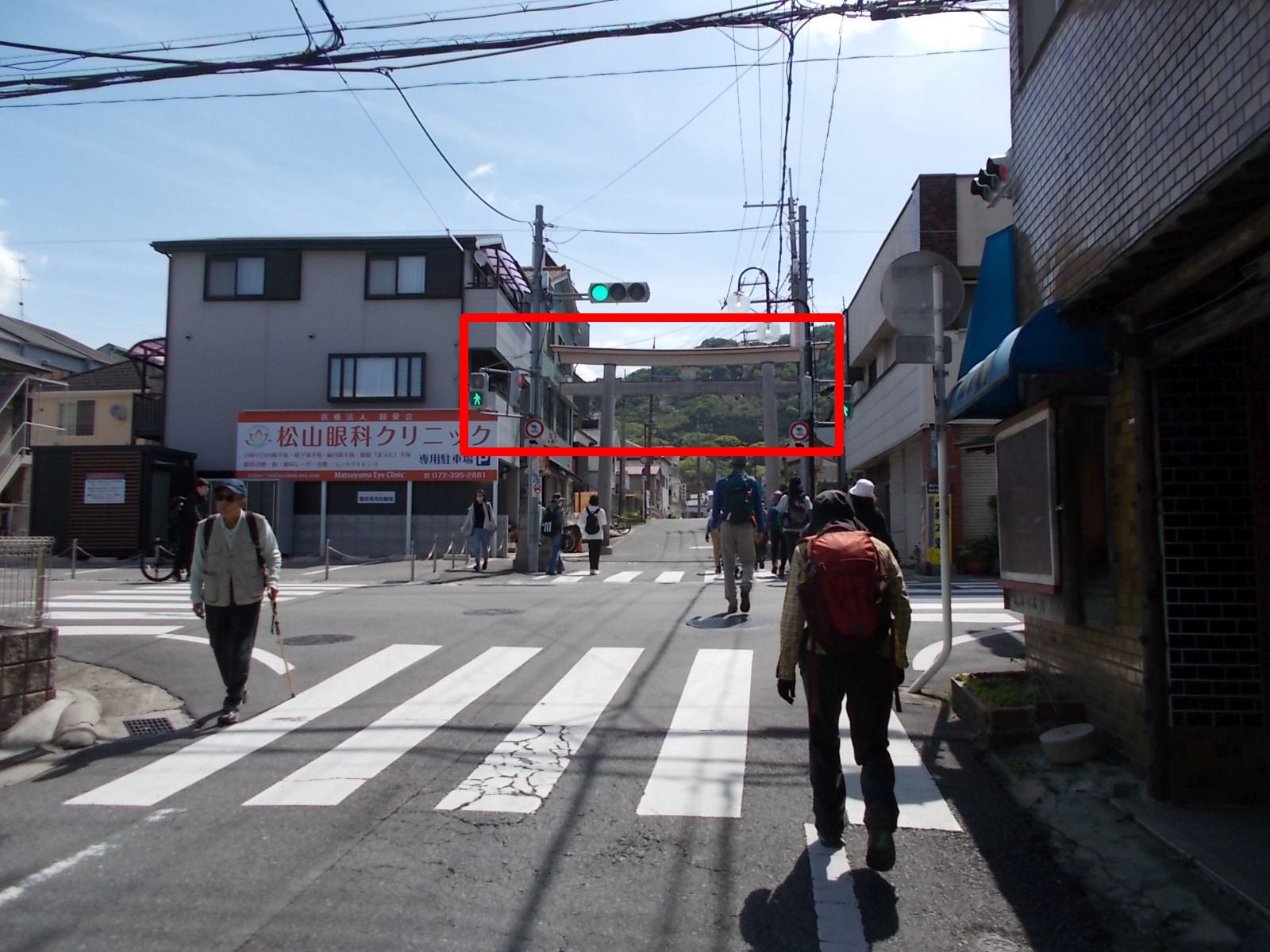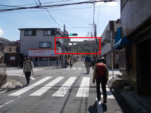 | この先、府道20号線を横断。 撮影した画像、信号機の下に四條畷神社一の鳥居が見える。(赤四角印) これを潜る。