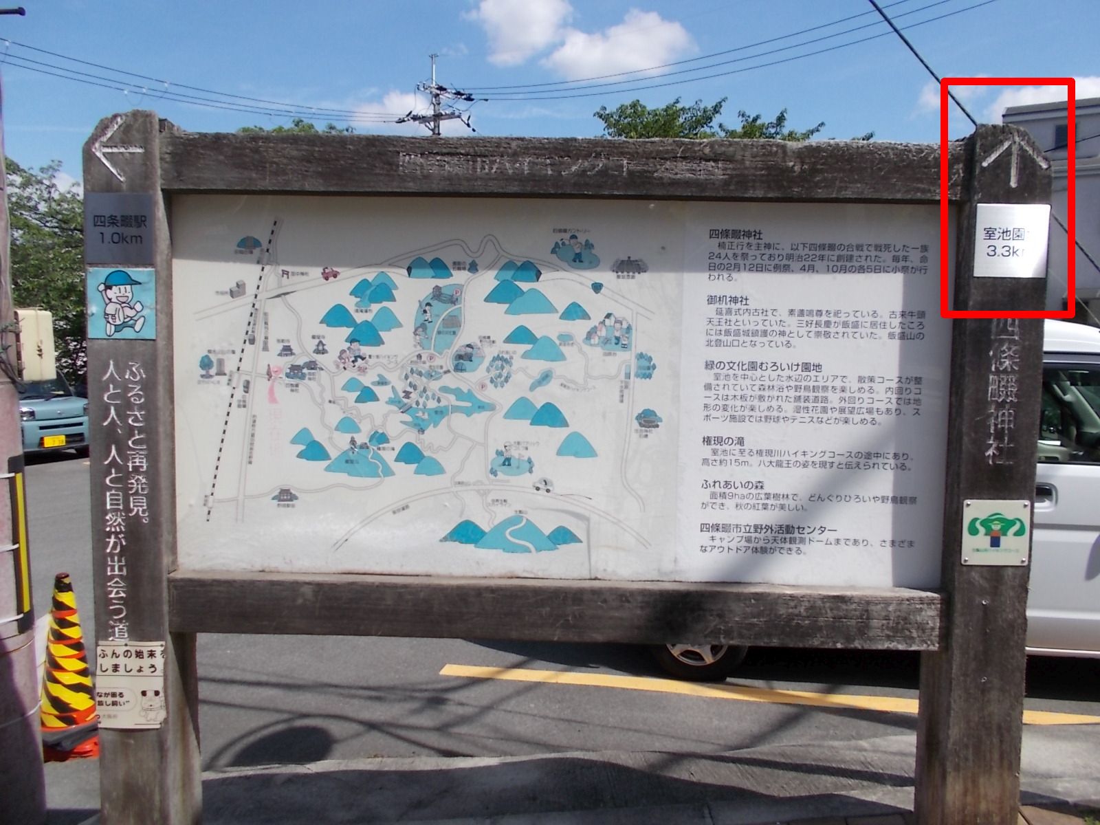 | 左折地点の角に権現川ハイキングコースを示すマップが掲げられている。 しかしながら、マップの絵図は色あせて見えにくい。 コースは「↑室生園地 3.3km」と記されている方向。(赤四角印)
