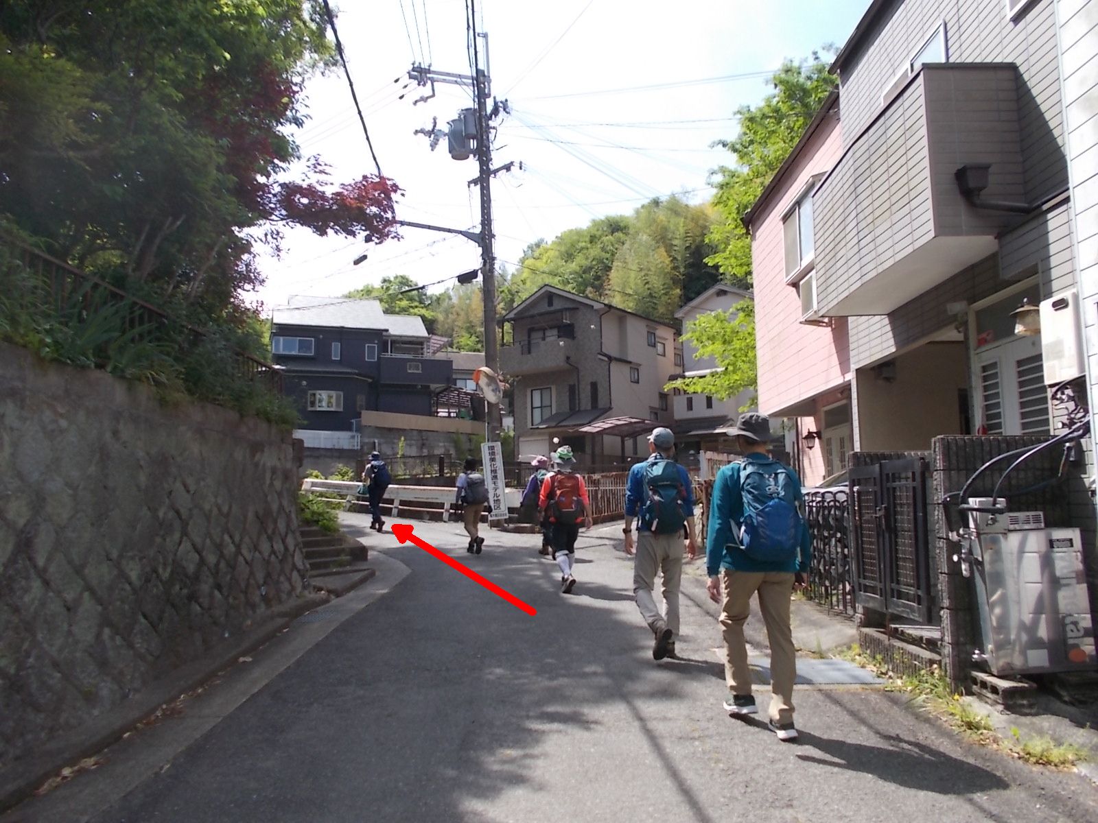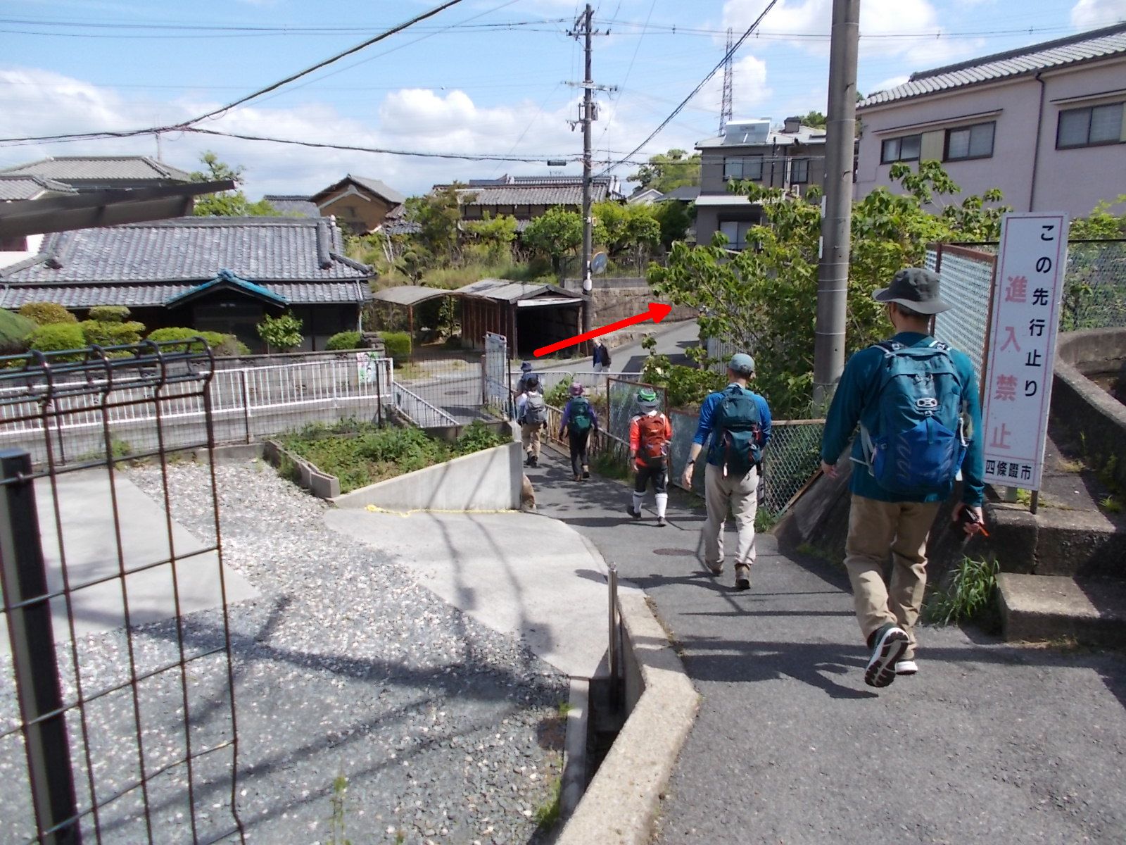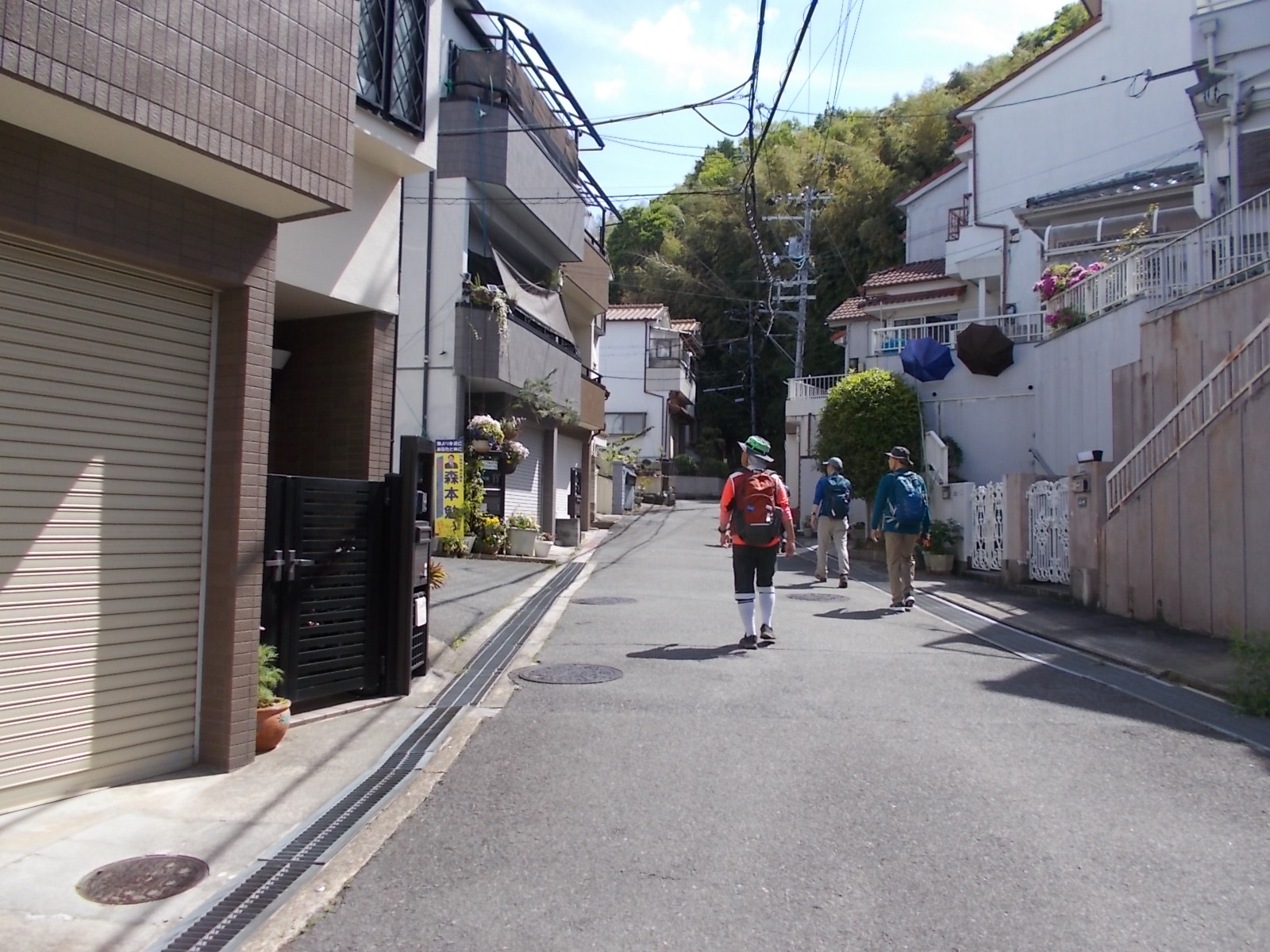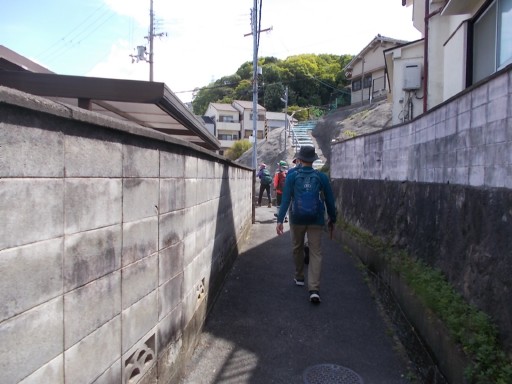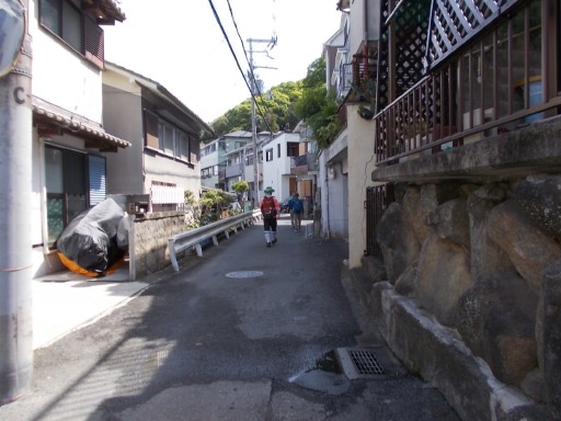 | 住宅地の中に続く狭い道を歩く。 この道ではクルマの対向は不可。