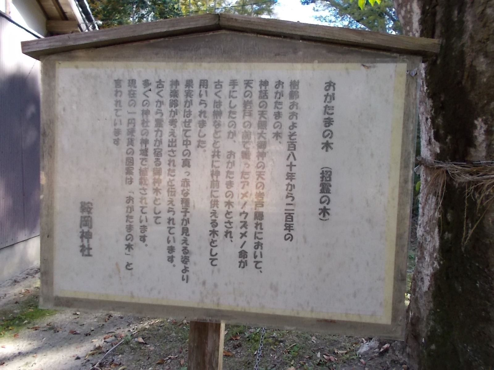 【AI による概要】 この看板は、鞍岡神社にある「おがたまの木(招霊の木)」について説明しています。 樹齢約180年から200年とされ、神話や神事との深いつながり、そして現在の1円硬貨のデザインモチーフとなっていることが記されています。 ・樹齢: 約180年〜200年 ・神話との関係: 天岩戸隠れの神話で、アメノウズメノミコトがこの木を手にしたとされる。 ・神事での利用: 古くは榊(さかき)などと共に神前に供えられていた。 ・現代とのつながり: 現在の1円硬貨の図案は、この「おがたまの木」であると言われている。