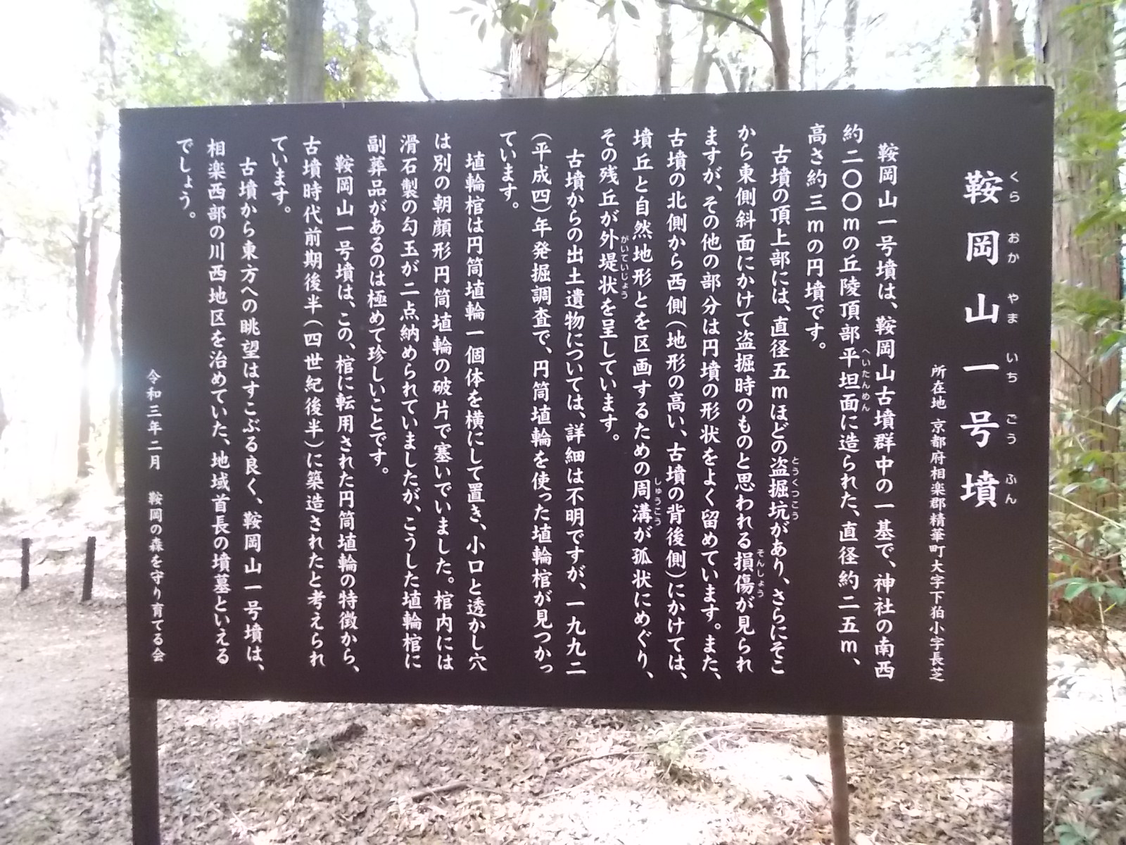 鞍岡山一号墳は、鞍岡山古墳群中の一基で、神社の南西約二〇〇mの丘陵頂部平坦面に造られた、直径約二五m、 高さ約三mの円墳です。 古墳の頂上部には、直径五mほどの盗掘坑(とうくつこう)があり、さらにそこから東側斜面にかけて盗掘時のものと思われる損傷(そんしょう)が見られますが、その他の部分は円墳の形状をよく留めています。 また、古墳の北側から西側(地形の高い、古墳の背後側)にかけては、墳丘と自然地形とを区画するための周溝(しゅうこう)が孤状にめぐり、 その残丘が外堤状(がいていじょう)を呈しています 古墳からの出土遺物については、詳細は不明ですが、一九九二 (平成四)年発掘調査で、円筒埴輪を使った埴輪棺が見つかっ ています。 埴輪棺は円筒埴輪一個体を横にして置き、小口と透かし穴は別の朝顔形円筒埴輪の破片で塞いでいました。 棺内には滑石製の勾玉が二点納められていましたが、こうした埴輪棺に副葬品があるのは極めて珍しいことです。 鞍岡山一号墳は、この、棺に転用された円筒埴輪の特徴から、古墳時代前期後半(四世紀後半)に築造されたと考えられています。 古墳から東方への眺望はすこぶる良く、鞍岡山一号墳は、相楽西部の川西地区を治めていた、地域首長の墳墓といえるでしょう。 令和三年二月 鞍岡の森を守り育てる会