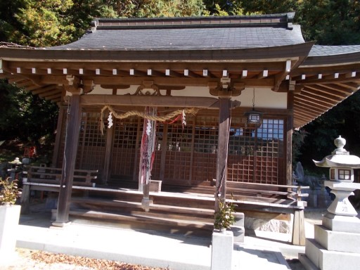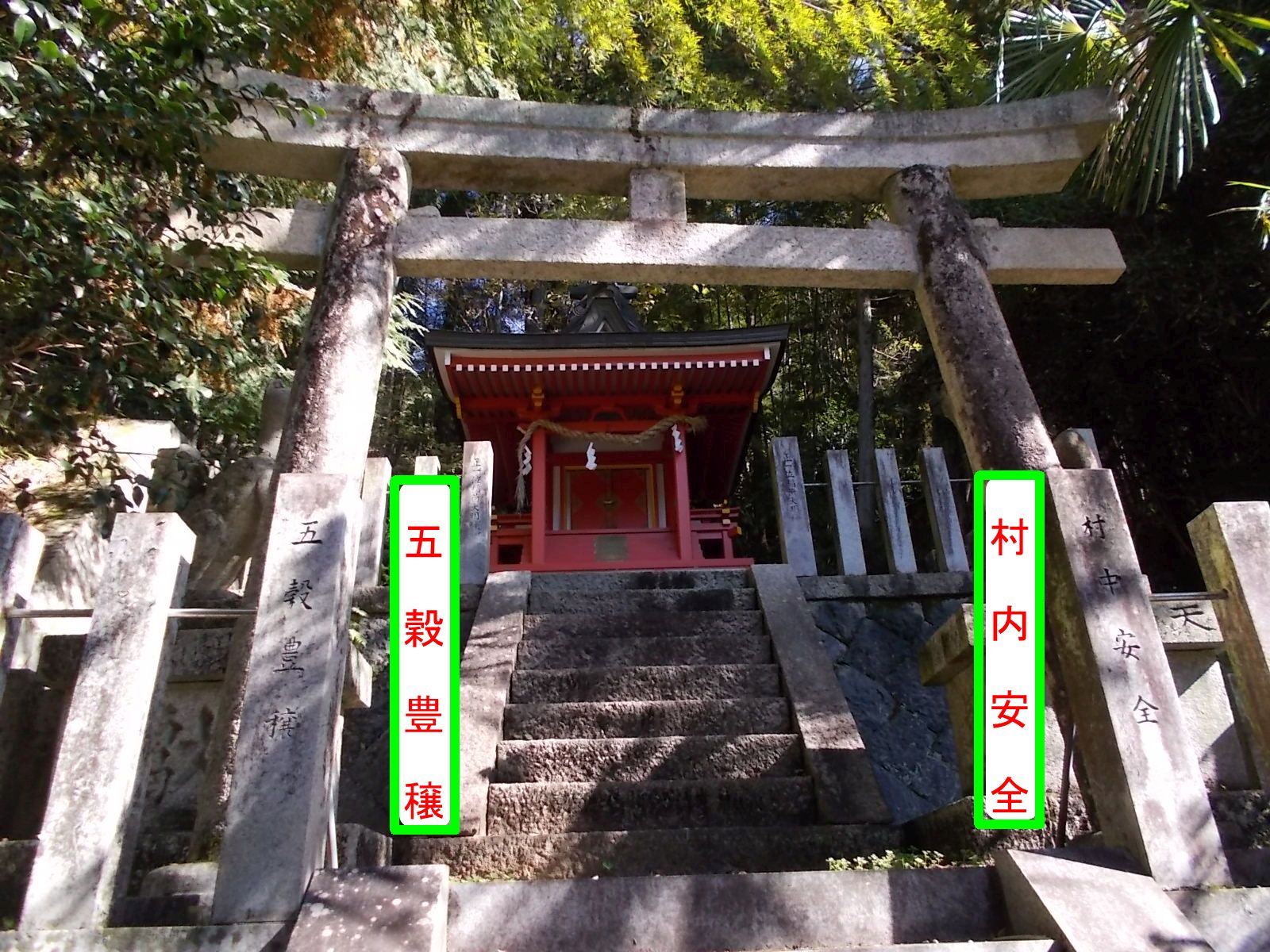 本殿。 玉垣の親柱には左右それぞれ「五穀豊穣」「村内安全」と刻まれている。
