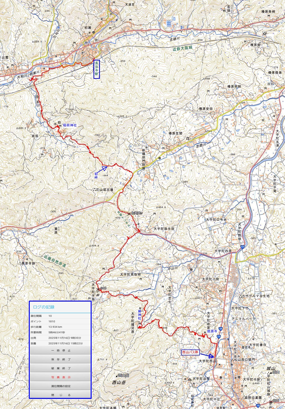 <概要> 2025年11月16日(日)は、「おおばこの会」に参加した。 題して阿騎野への道~狛峠、女寄峠をこえて阿紀神社へ~ 狛峠を歩くのはこれが初めて。 今はまったく歩かれていないという印象で、ハイカーも歩く人はごく限られているようだ。 更に嬉河原屑神社から徳源寺へ向かう道も酷かった。 倒木が登山道を塞ぎプチ道迷いした。 久し振りの藪コギだったが、このようなコースを歩くのは避けたい。 参加者の男性が、二ヶ所、頭部と腕に木の枝が突き刺さり、特に頭部は出血多量で血が止まらなかった。 <コース> 近鉄大阪線長谷寺駅_狛(稲荷)神社_狛(こま)峠_女寄(みより)峠_小(こ)峠_嬉河原屑(うれしがわらくず)神社_徳源寺_西山バス停_<バス>_近鉄大阪線榛原駅 尚、当初、訪問予定の阿紀神社はバスのダイヤの関係でカット。 <メモ> ・参加者: 17名。 ・コース歩行 (長谷寺駅~西山バス停までの所要時間と距離) 歩行距離: 約13.9km。 所要時間: 5時間46分。(9:35→15:22 ・反省会: 蔵元豊祝 西大寺店 画像は当日歩いたGPSログを表示。
