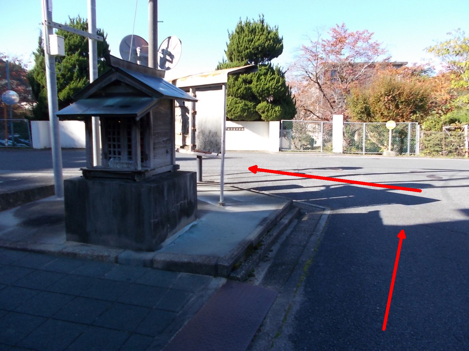 正面に桜井市立桜井東中学校の校舎を見て辻を左折。 辻には祠があった。 つづき。