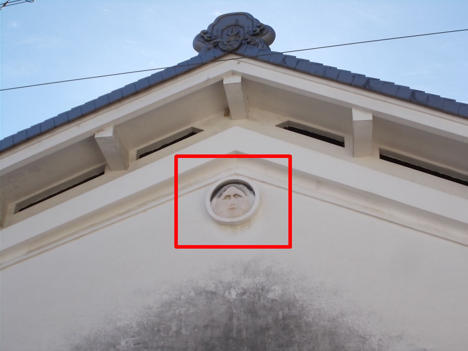 | 参道脇に建つ切妻屋根(土蔵)に、お多福のようなレリーフが施されていた。 【参考】 精華町下狛の町並み 下狛の郷愁風景