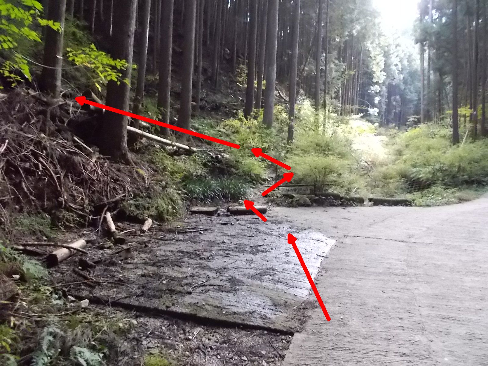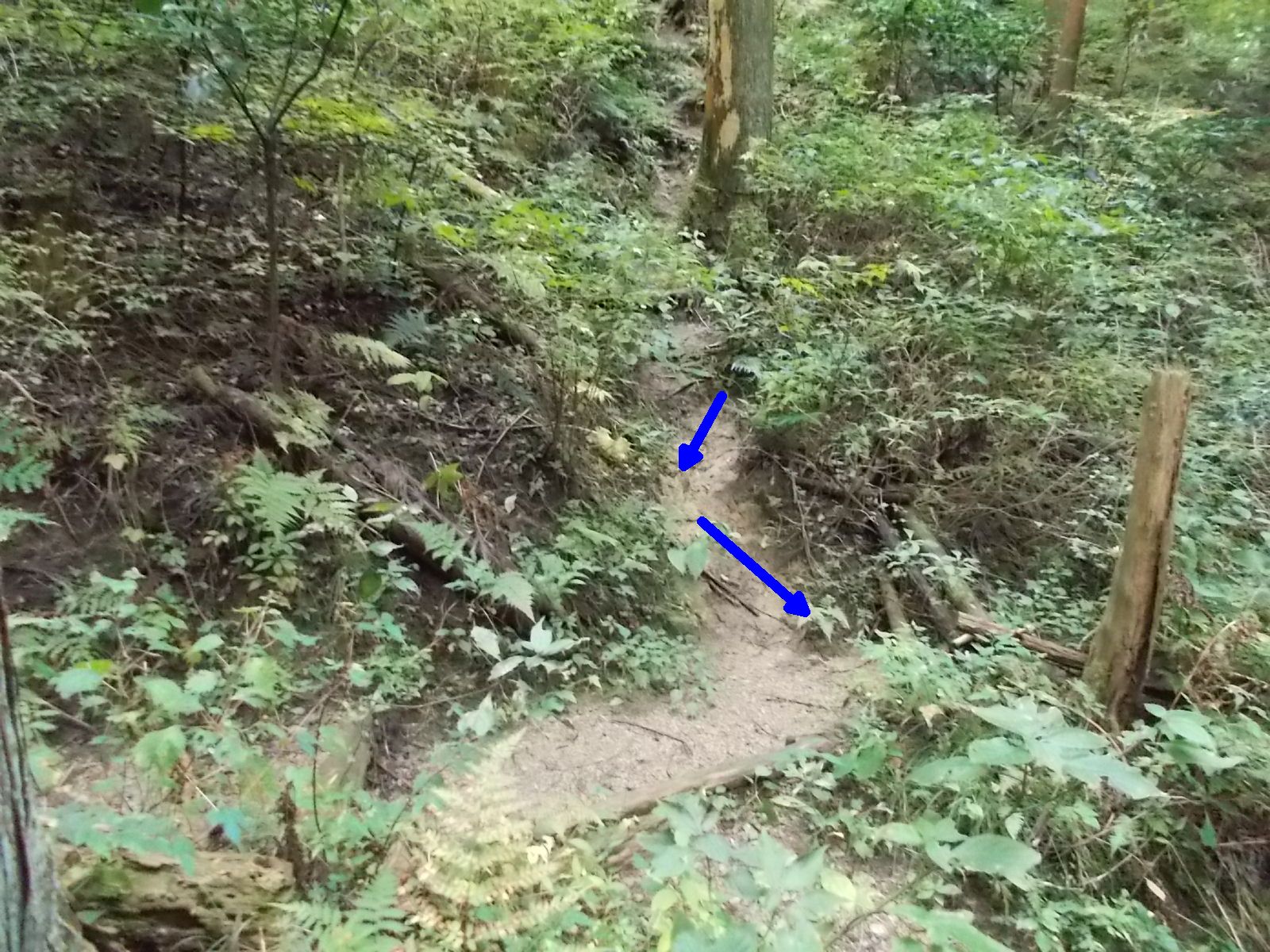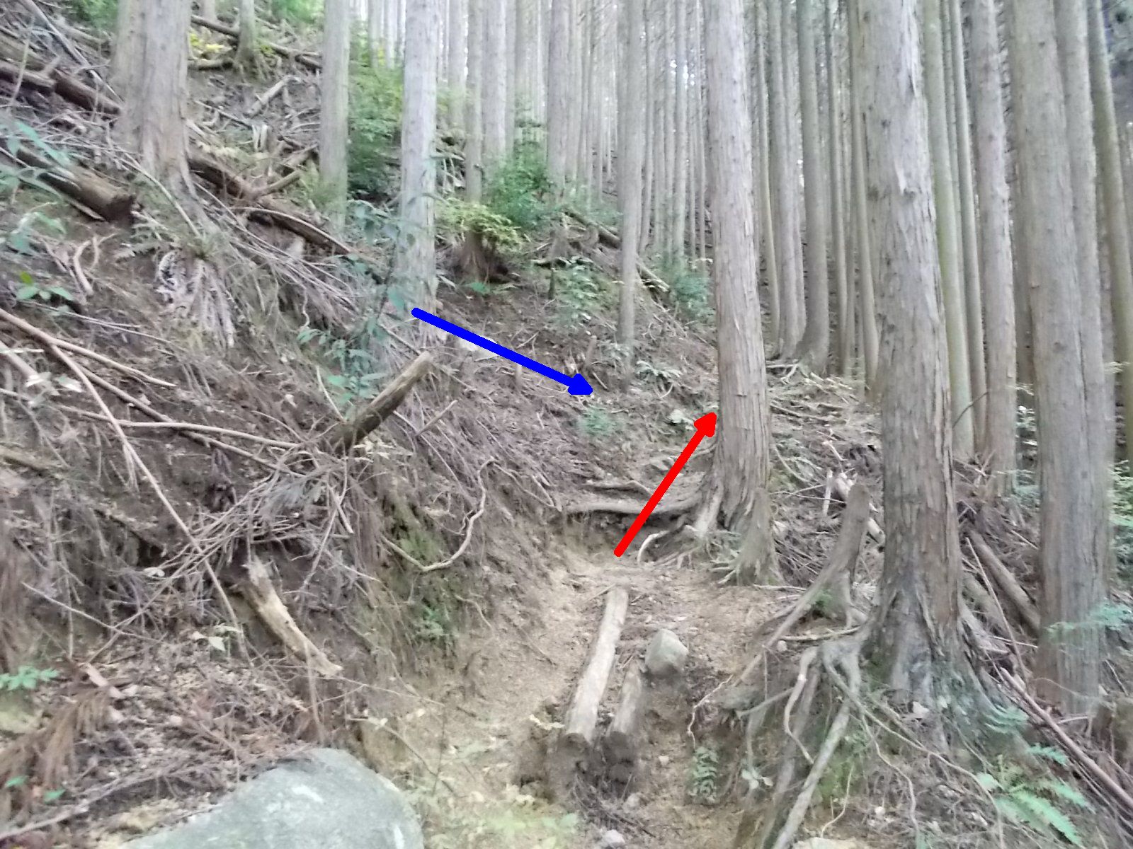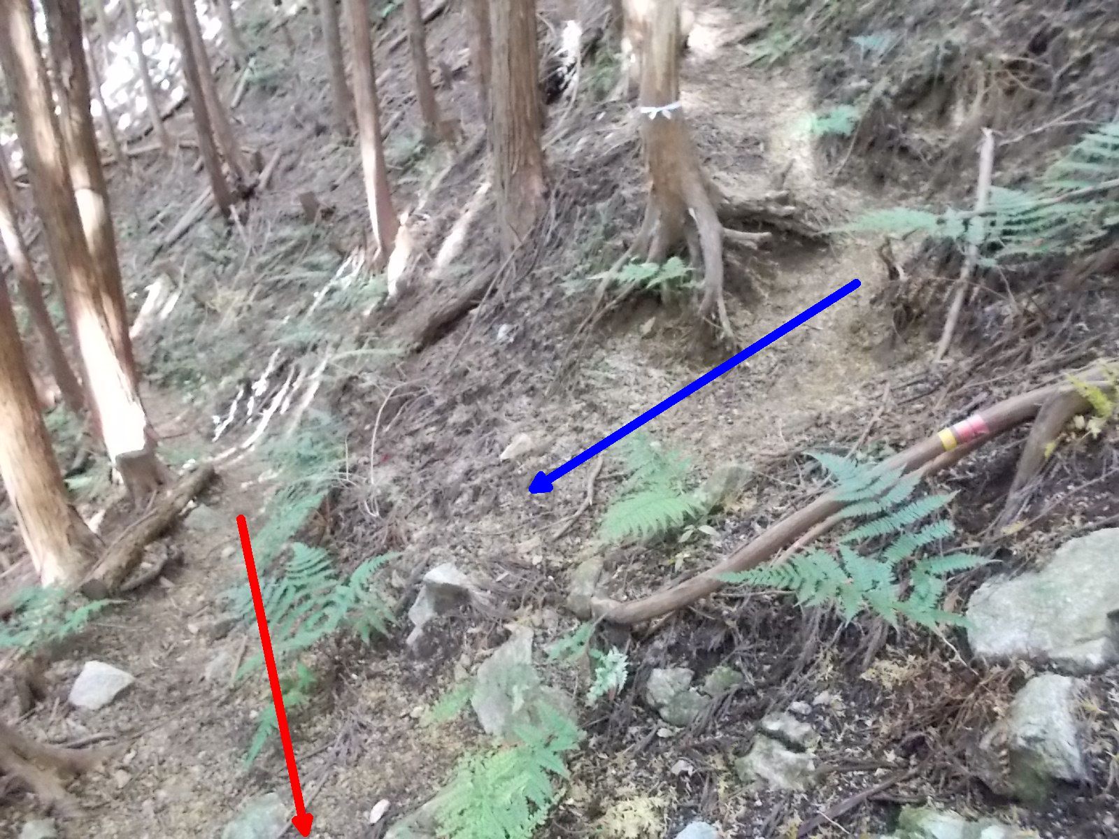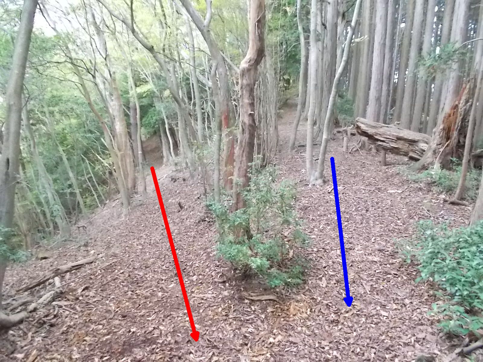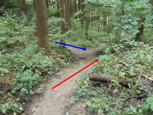 この先、分岐。 コースは直進。(赤矢印) 左上から、別ルートの下山道が合流。(青矢印)