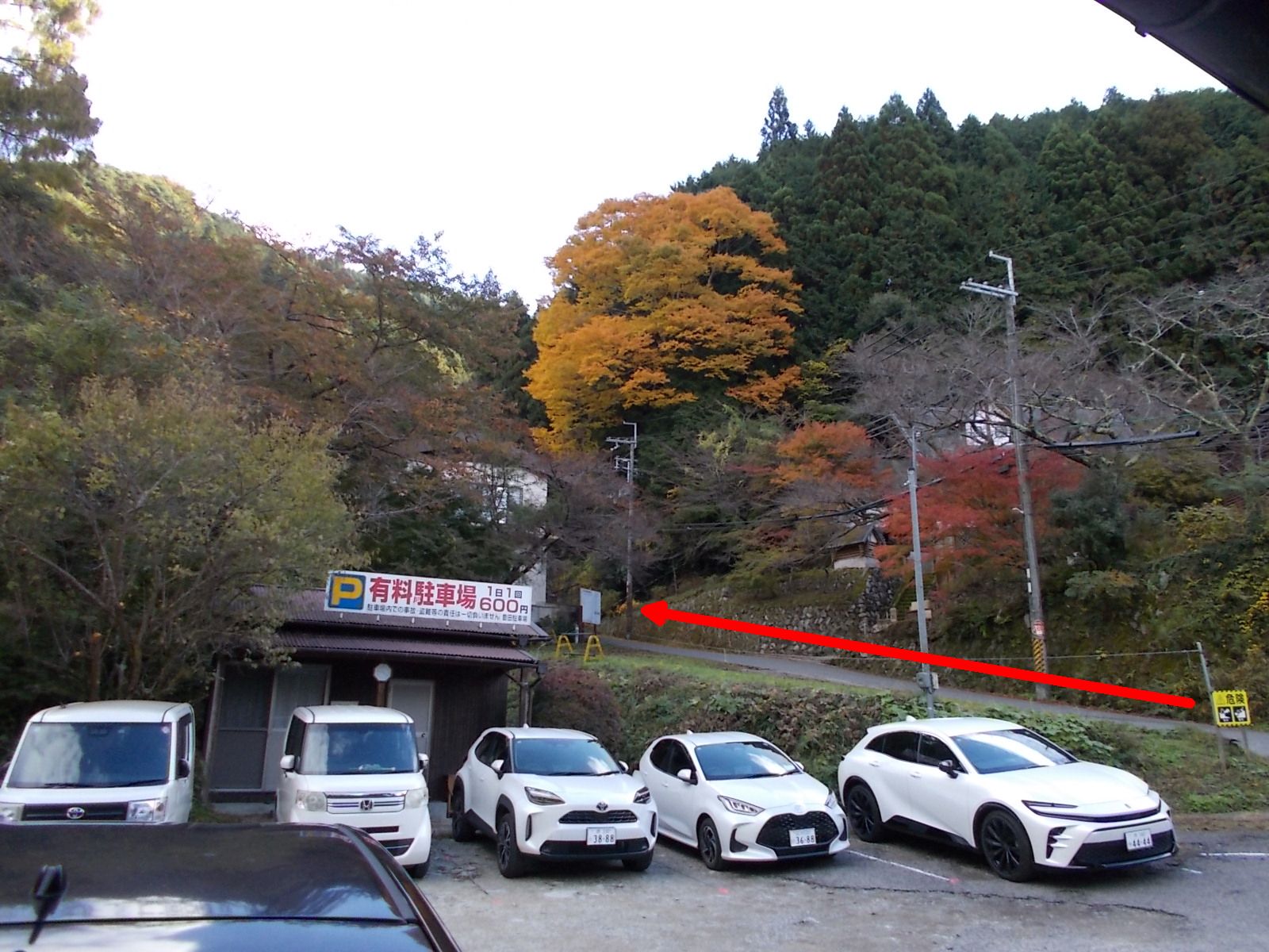 登山口駐車場を出発。 府道705号線に沿って東へ歩く。