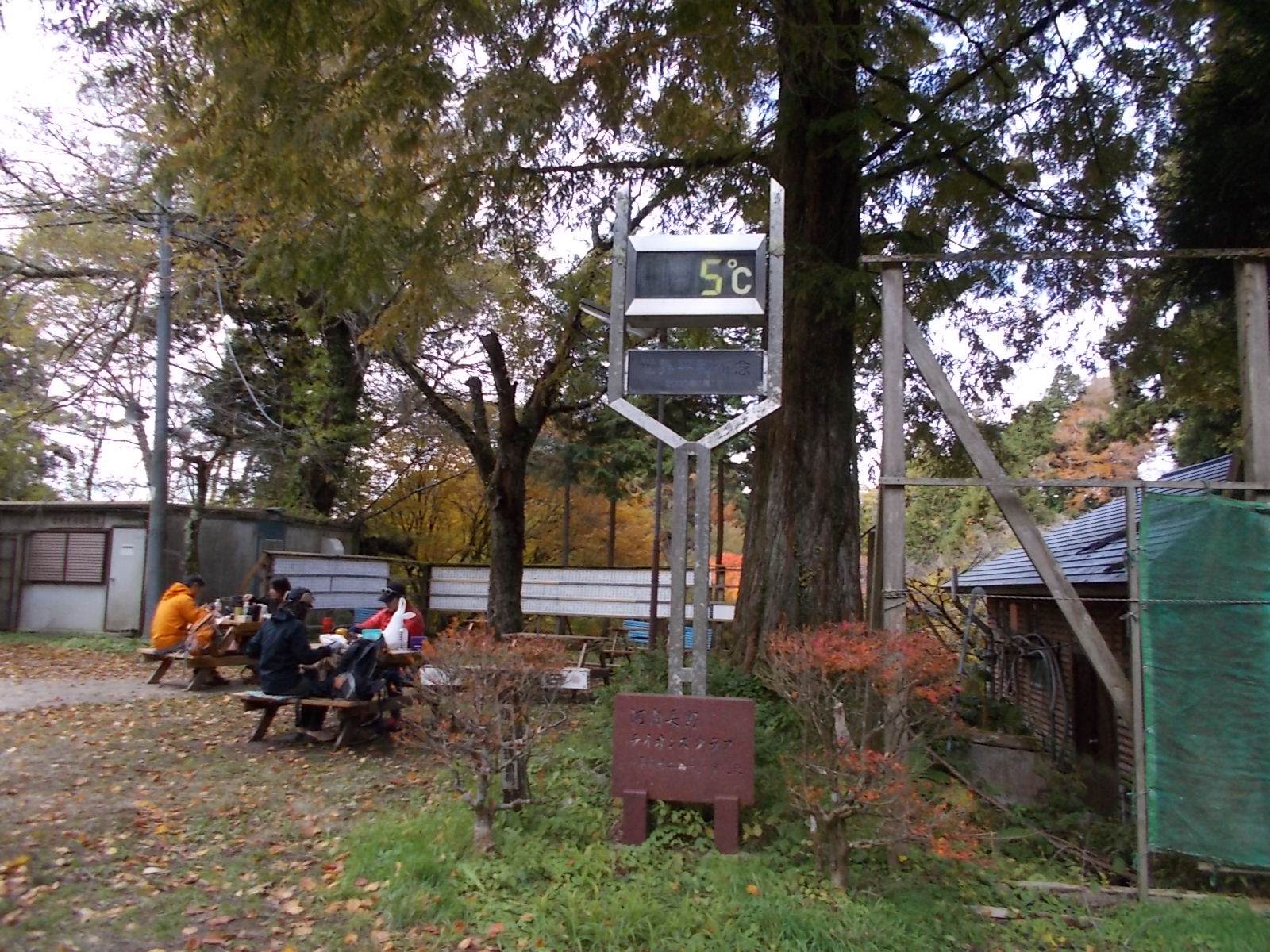 売店前のモミジ。 大きなモミジの木が二本植えられており、東のモミジの方が黄葉が早く始まる。 画像は西のモミジで、ほぼピークと云った印象。 尚、この日、東側の木は落葉が盛んだった。