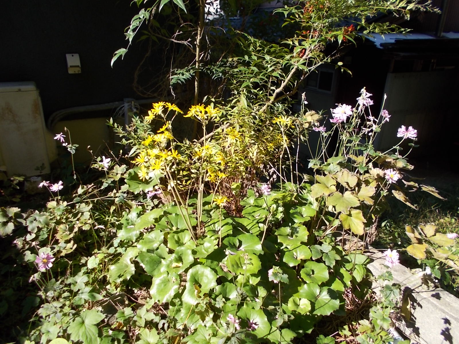 画像中央の黄色い花はツワブキ。(石蕗) 右上、ピンク色の花はシュウメイギク。(秋明菊)