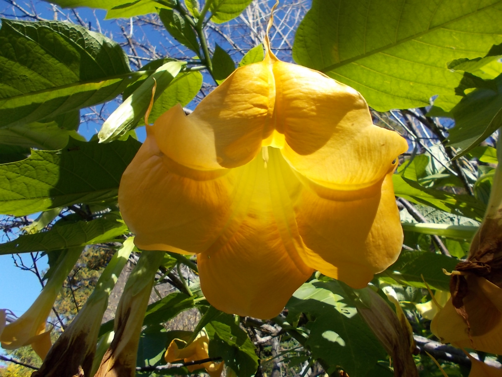 画像は、少しお道化て撮影した。 キダチチョウセンアサガオ属。(木立朝鮮朝顔)