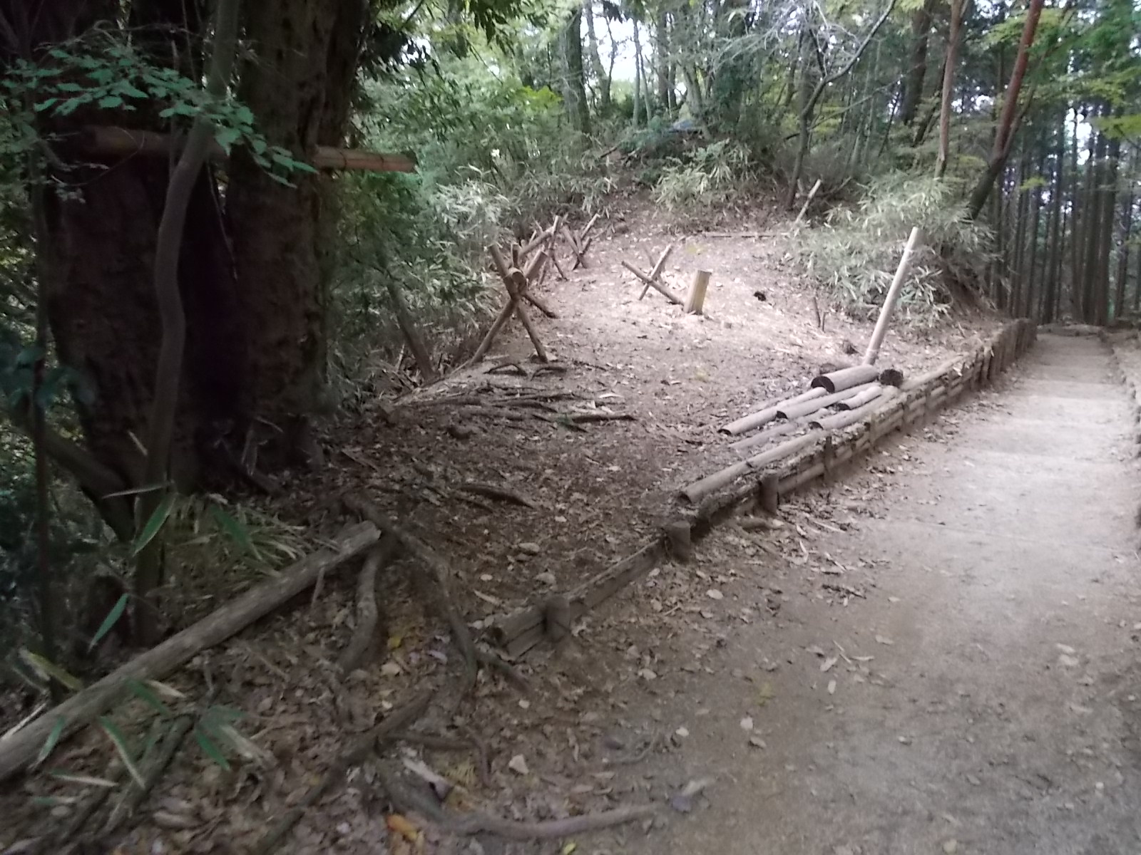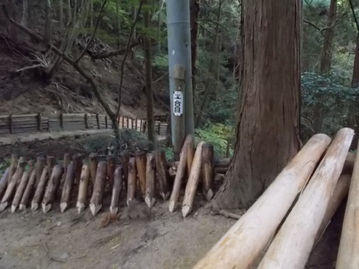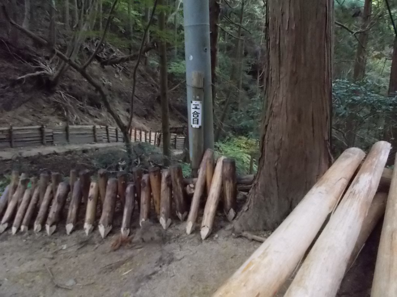 登山道を整備する為の丸太などの置き場。 木材の切断などの作業もここで行われている。