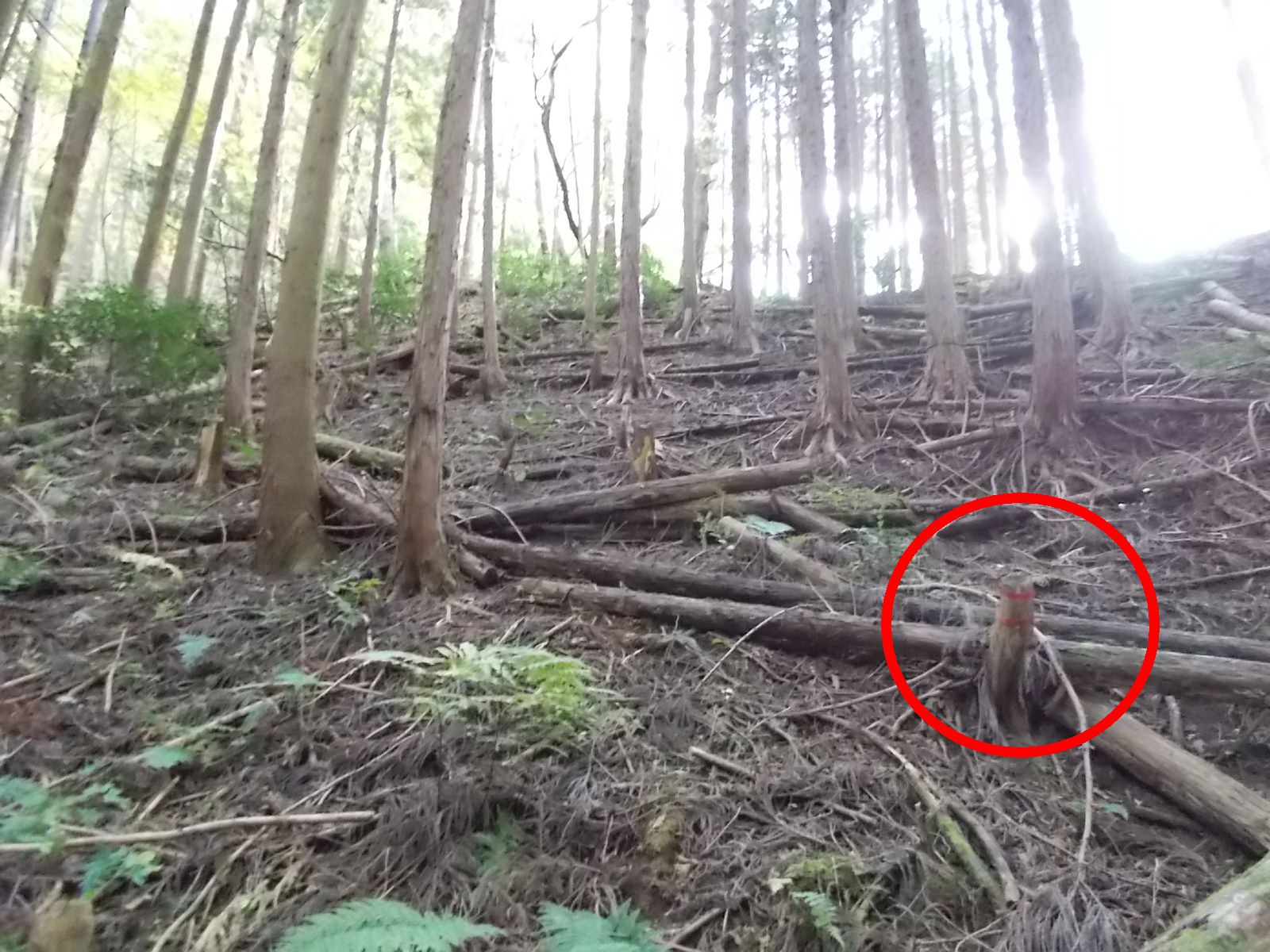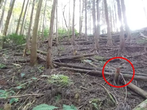 この辺り、伐採された木の幹が残っている。 伐採する以前は薄暗かったが、かなり明るくなった。