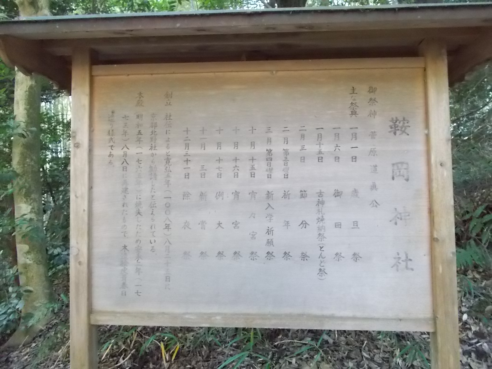 【参考】精華町観光ポータルサイト 寛弘5(1008)年、京都北野社から勧請し創立されたといわれています。 明和5(1768)年に焼失し、安永2(1773)年に再建されたことが記された棟札が伝わっています。 また神宮寺として、神宮寺と宝光寺と明王院の3つの寺院があったと伝わっており、「文政4年明王院」の箱書がある「鞍阜山」の一行書(掛幅)が残されています。 明治16年に、社名を「天満宮」から「鞍岡神社」に改え称しました。