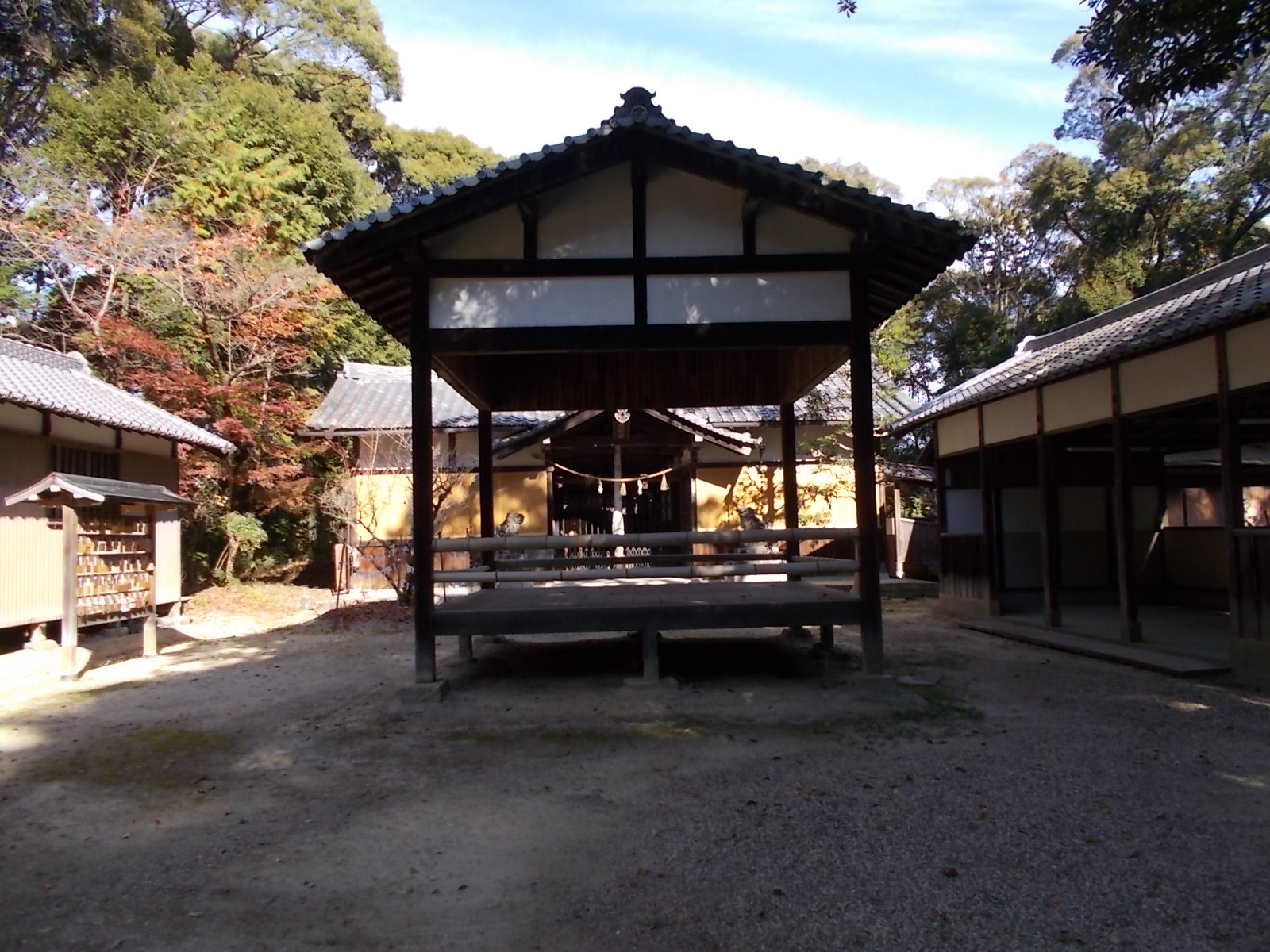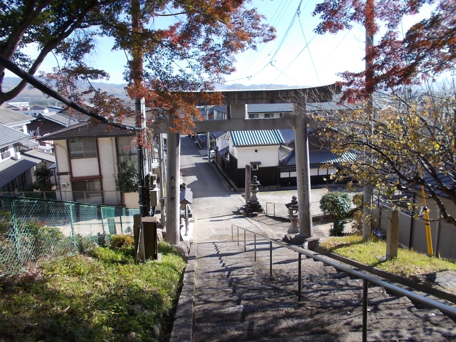 本殿の御祭神(菅原道真公)よりも前からこの土地(地域)の神様として祀られていたと伝えられており 『上の御殿(かみのごてん)』とも呼ばれている。 また、古くから細い石段参道は、神様に背を向けず後ろ向きに降りてお参りするよう言い伝えられていることから『後ろ向きの神さん」』とも呼ばれている。