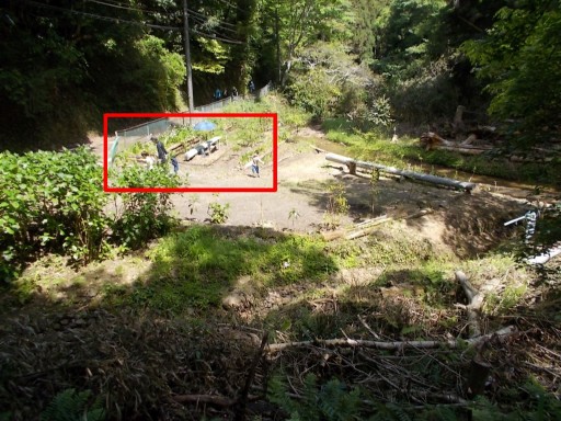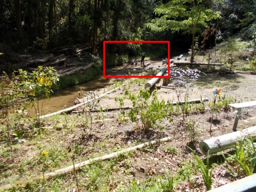 暫く歩くと、権現川で水遊びをする親子の姿があった。(赤四角印)