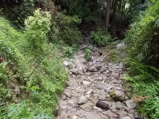 右岸に踏み跡があるが、砂地で滑りやすい。 谷の中を歩くほうが安全。