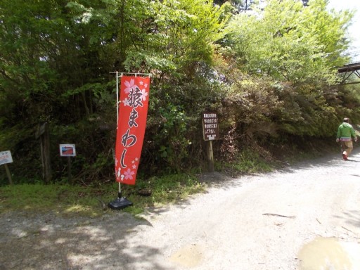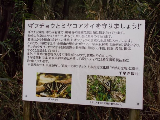 | ギフチョウとミヤコアオイの関係について説明している。 この説明板は千早赤阪村が設置したもの。 御所市が平成26年に「葛城山のギフチョウ」を市指定文化財(天然記念物)に指定したことから、御所市と連携して保護監視活動に取り組むとのこと。 この場所は御所市と千早赤坂村の府県境に位置している。 尚、この付近でギフチョウを見ることは珍しくない。 時期的には丁度今頃。(5月前後)