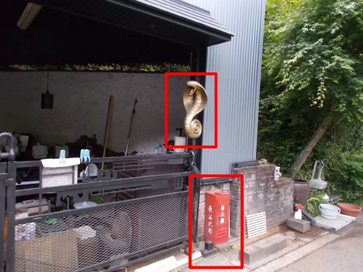 コブラの飾り物らしい。 消火器には「原谷北部」と記されている。 つづく。
