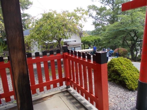 先頭グループの昼食、休憩のタイムテーブル。 (昼食 11:50~12:20) コースはこの建物(社務所)の横を通り抜けるようだ。