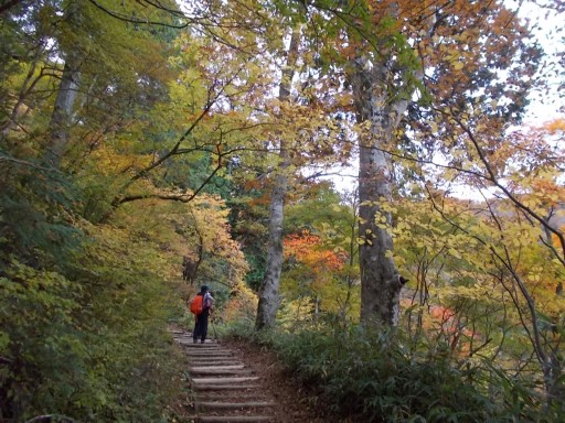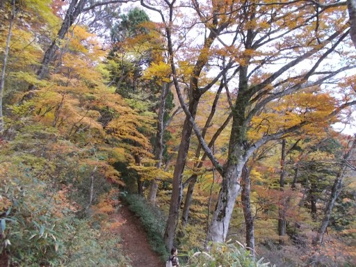 八合目に到着。 この時期に千早本道を歩くのは、ブナの黄葉が見られるから。 八合目から登山道は旧登山道と新登山道に分かれる。 新登山道がブナの黄葉が楽しめる。 新道はこの季節だけではなく、新緑、樹氷の季節も。