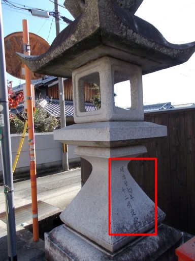 | 参道を東方向へ歩き、常夜燈(明治二十七年の銘)が建つ辻で右折。(南)