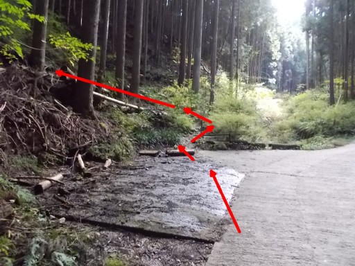 正面、風呂ノ谷の手前で、橋を渡らず(暗渠)左から尾根筋に取付く。(赤矢印)