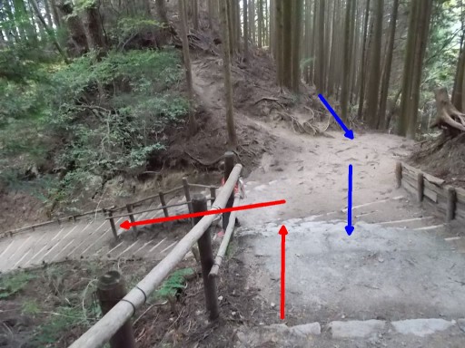 五合目を過ぎて暫く下ると分岐。 登りは水ヶ阪尾根を歩いて来た。(青矢印) 下山は千早本道を下る。(赤矢印)