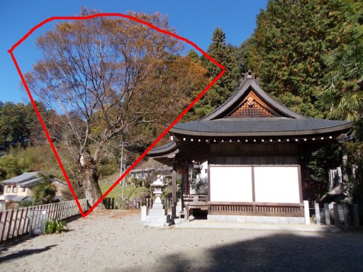拝殿横に到着。 拝殿の前に見える巨樹はケヤキだろう。(欅) 【参考】 「欅」は「きへん(人)」と「擧(きょ)」からなり、まっすぐ伸びた幹と枝が手を挙げた様子に似ていることから名付けられたそうだ。